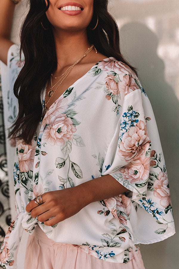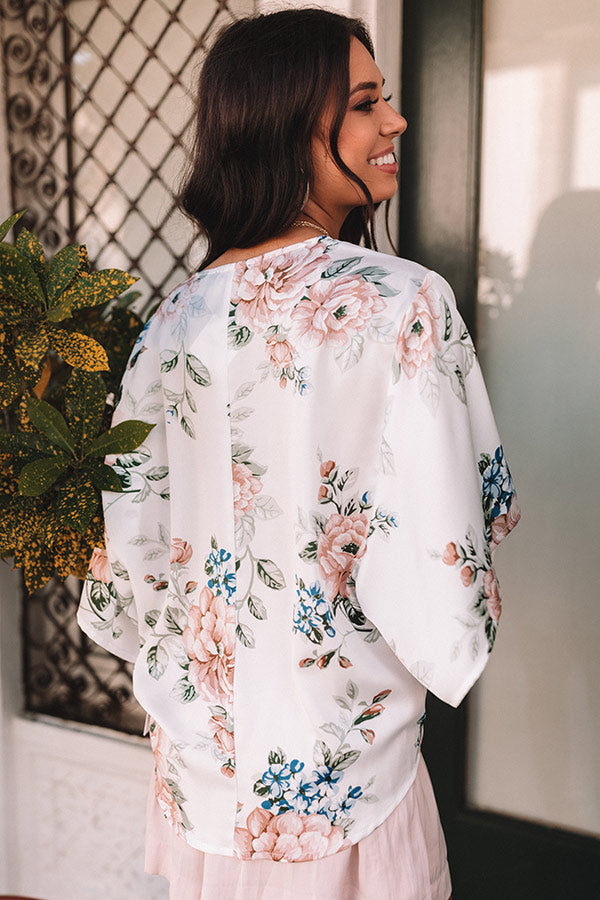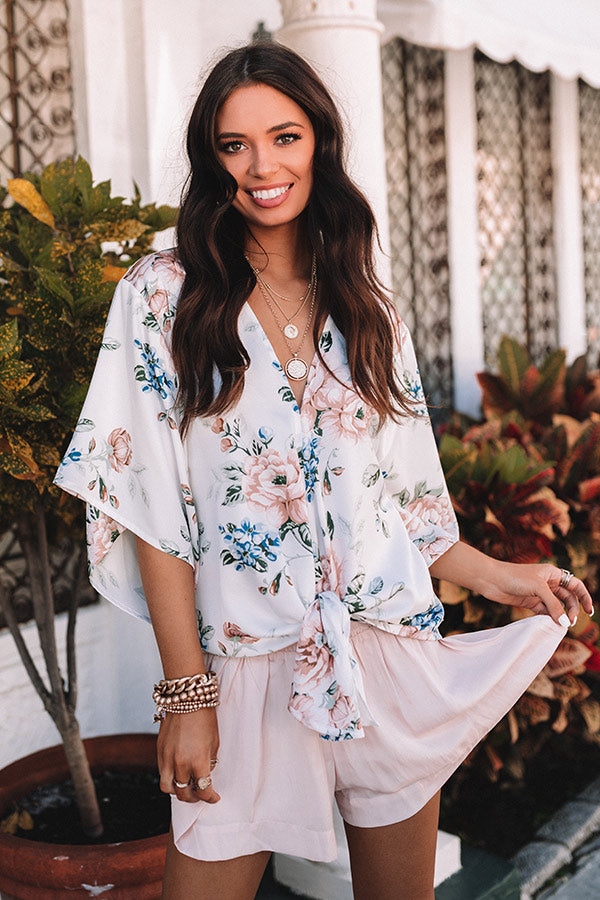 Spring into style with our adorable white 'Cherry Hill' top featuring ultra lightweight flowy material patterned with a blue, green, and pink hued floral print, a v-cut neckline, oversized bat wing half sleeves, and a slouched silhouette that falls into a tied front hemline! Measurements