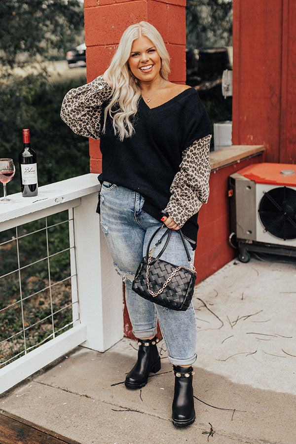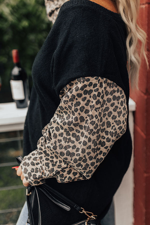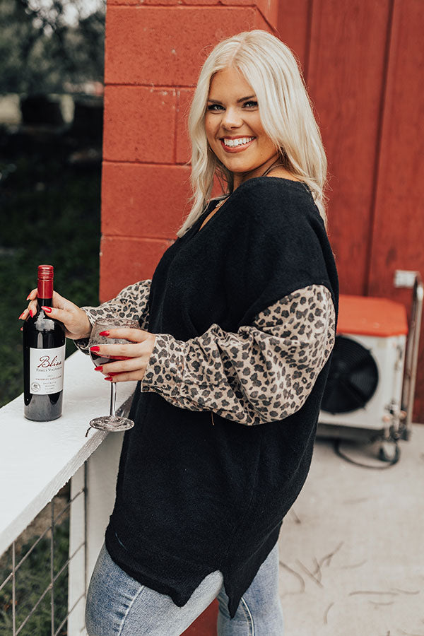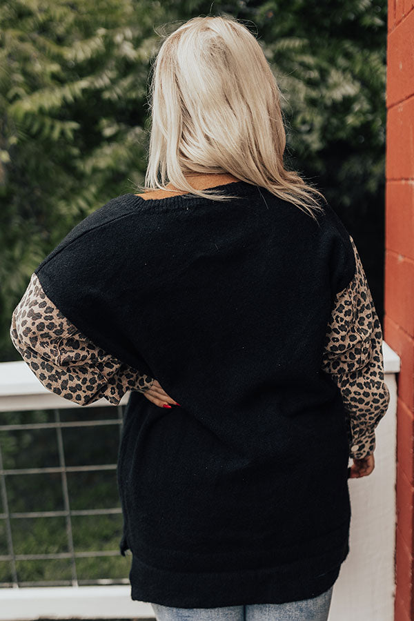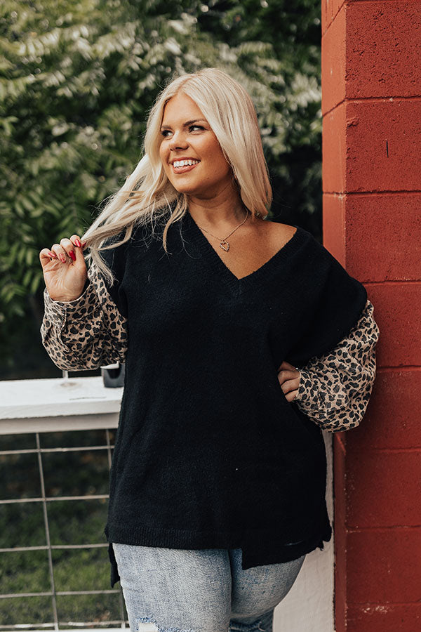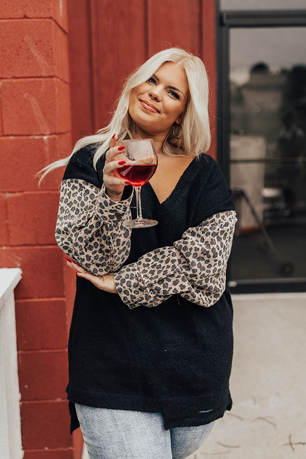Plus Size - - Make a statement in our unique black 'Chestnut Chill Sweater' featuring soft tight knit material, a v-cut neckline, long loose sleeves with button closure cuffs and patterned with a black and brown leopard print, and a slouched silhouette that falls into a straight hemline with distressed detailing!