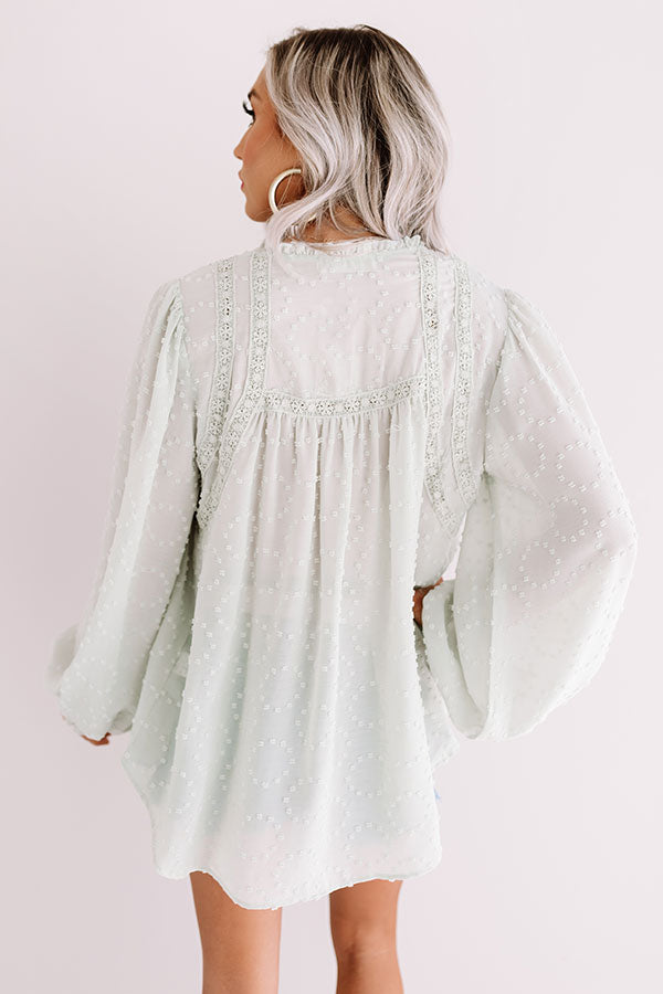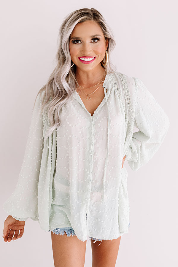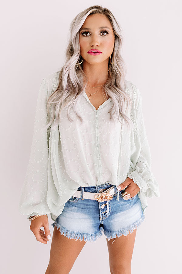Dress to have an amazing day in this chic pear colored shift top featuring lightweight breezy material patterned with subtle polka dot texturing, a button up front, a v-cut neckline with ruffled trim detailing and a tie closure, oversized bubble sleeves with fitted cuffs and intricate crochet detailing across the shoulders, and an ultra relaxed silhouette that falls into a rounded hemline! We have styled this classic piece with some distressed denim shorts and a stone hued bootie and statement belt, but you can also wear it with some white flares, "The Melina Heel in Latte," our "Chic Islander Sunnies in Latte," and our "Chic Success Faux Leather Tote in Iced Latte!" Measurements