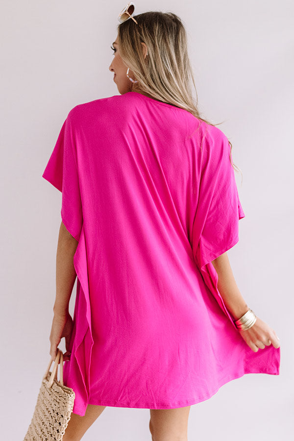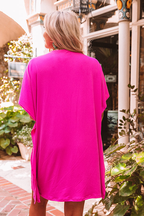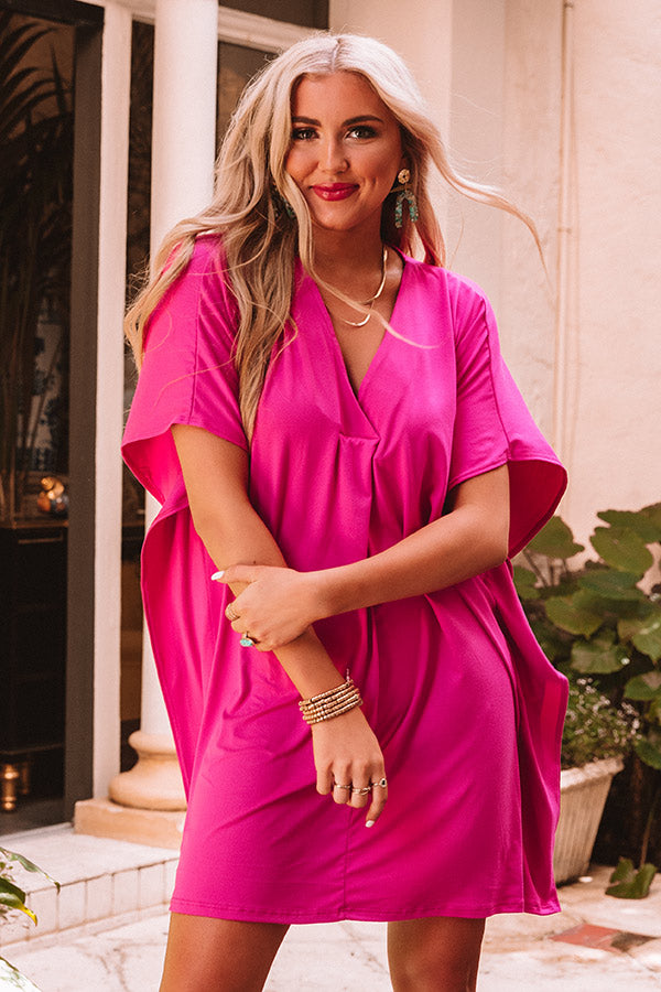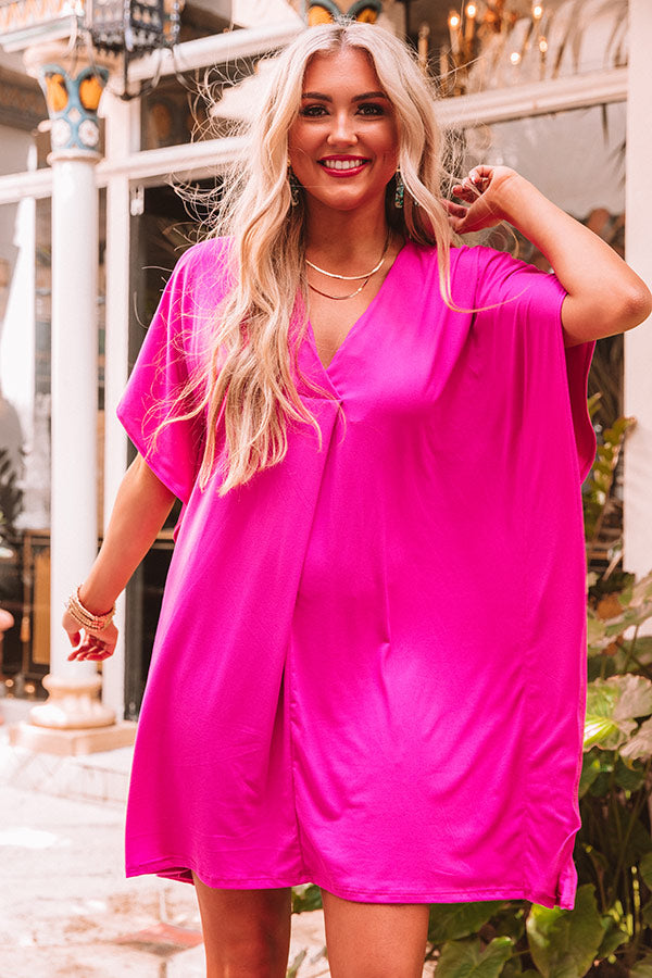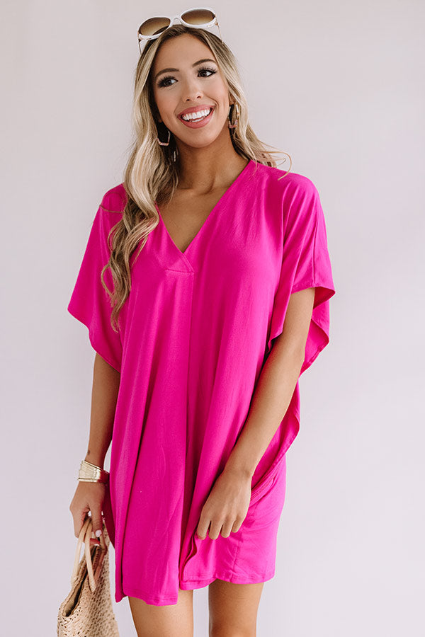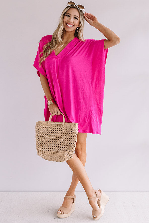 What's not to love about our casual hot pink "Chic Arrival Shift Dress?" With its soft lightweight material, a deep v-cut neckline, short loose sleeves, accent side flaps, and an ultra relaxed t-shirt silhouette that falls into a straight mid-thigh length hemline, it's the perfect warm weather piece! This closet essential can be styled a variety of ways like with a neutral heel, straw tote, and sunnies, but you can also wear it layered under a distressed denim jacket with "The Lela Espadrille in White" and our "All Caught Up Headband in Ivory!" Measurements
