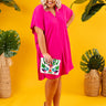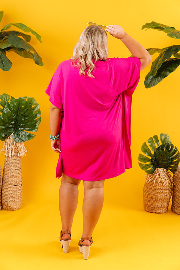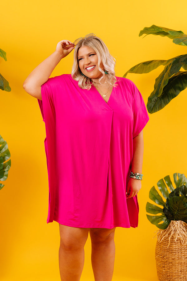 Plus Size - What's not to love about our casual hot pink 'Chic Arrival Shift Dress?' With its soft lightweight material, a deep v-cut neckline, short loose sleeves, accent side flaps, and an ultra relaxed t-shirt silhouette that falls into a straight mid-thigh length hemline, it's the perfect warm weather piece! Measurements