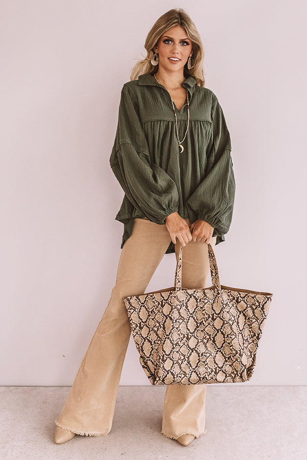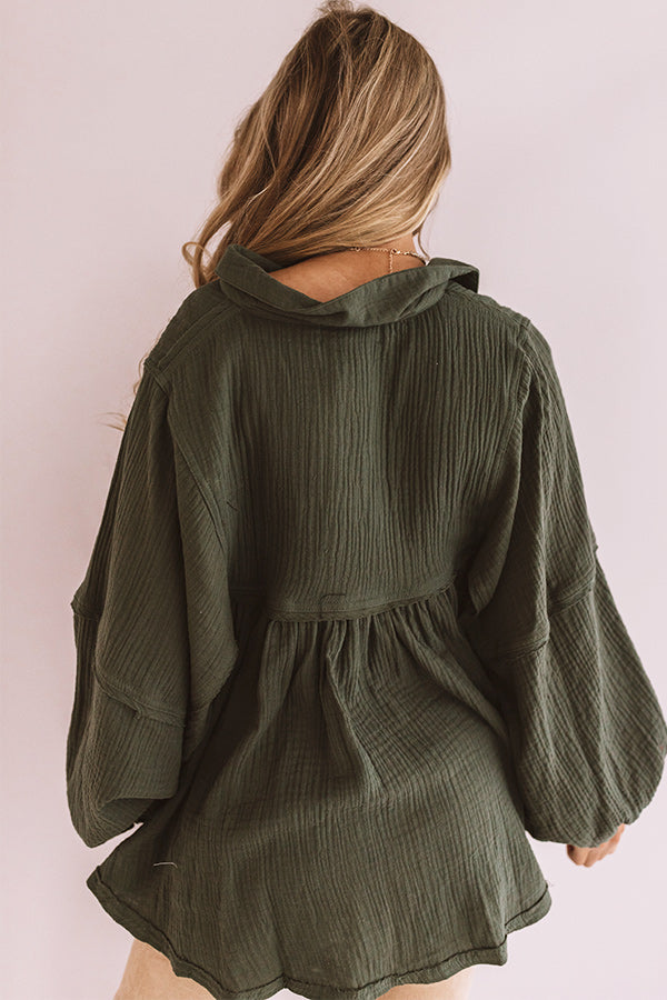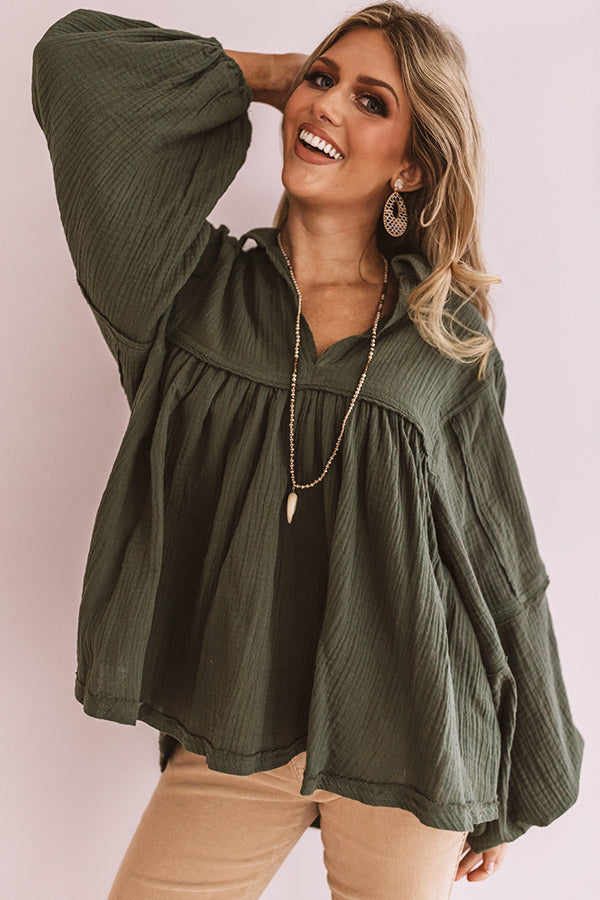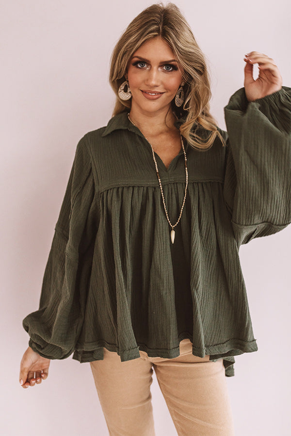 Our hunter green colored "Chic Charms" top is the perfect wear-anywhere piece for all your plans with its lightweight material with ribbed texturing, a collared v-cut neckline, long oversized bishop sleeves with fitted cuffs, and a relaxed babydoll silhouette that falls into an uneven hemline! We have effortlessly paired this transitional top with some khaki flares, neutral booties, and a snake print tote, but you can also wear it with some distressed ankle skinnies, "The Seraphina Faux Leather Wedge in Grey," and our "Bold Ambition Hat in Grey!" Measurements