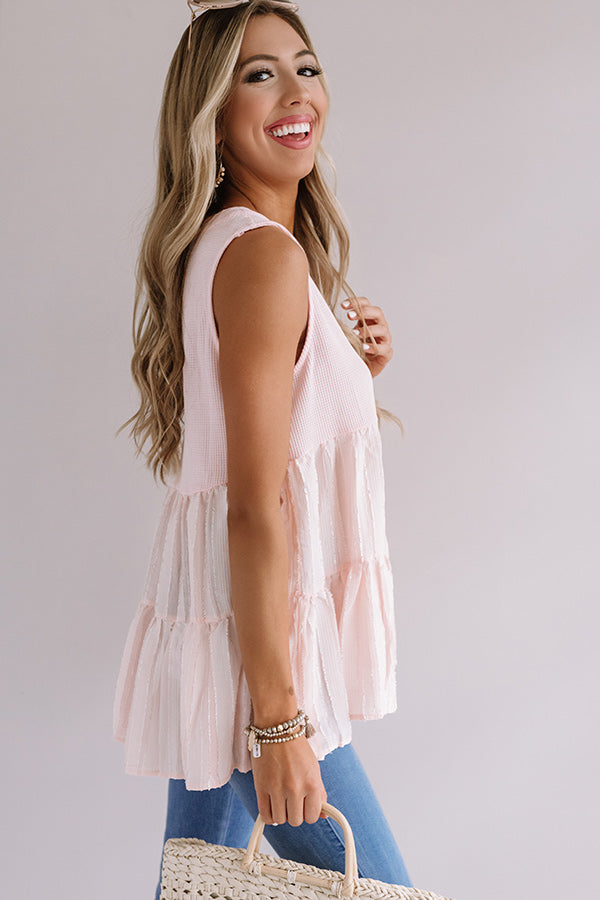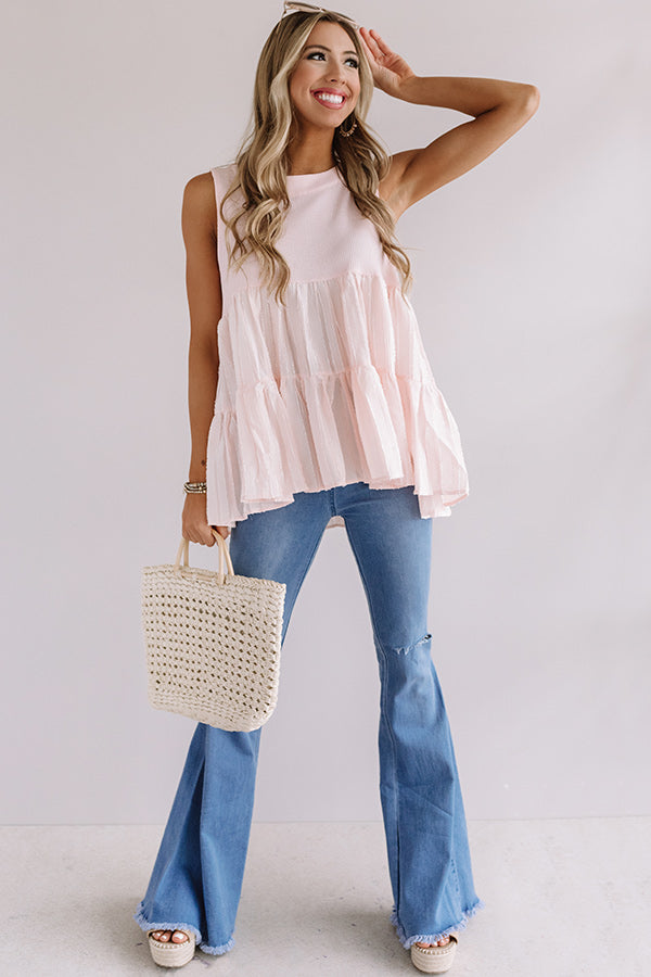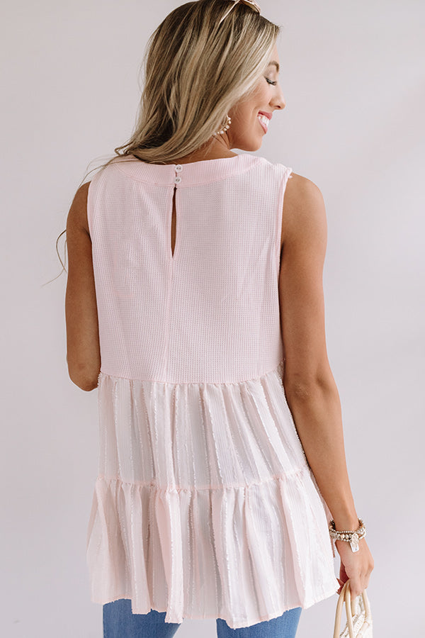 You are sure to look like a "chic city girl" when you wear this adorable pink top featuring lightweight material with waffle knit texturing on the bodice, a high rounded neckline, wide shoulder straps, a keyhole accented upper back with a button closure, and an tiered babydoll silhouette that falls into an uneven tunic length hemline! We have styled this cutie with some light wash flares, wedges, and a net bag, but you can also wear it with some distressed jean shorts, "The Jess Faux Suede Heel in Natural," and our "All Caught Up Headband in Ivory!" Measurements