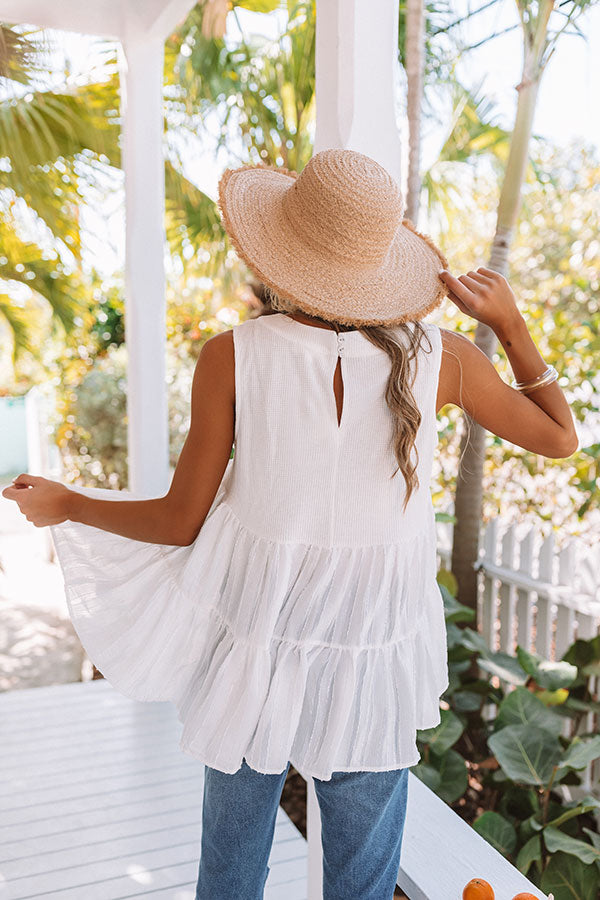 You are sure to look like a "chic city girl" when you wear this adorable white top featuring lightweight material with waffle knit texturing on the bodice, a high rounded neckline, wide shoulder straps, a keyhole accented upper back with a button closure, and an tiered babydoll silhouette that falls into an uneven tunic length hemline! We have styled this cutie with some distressed ankle skinnies, a neutral espadrille, and a straw hat, but you can also wear it with some frayed denim shorts, "The Underwood Faux Leather Wedge in Blush," and our "Champagne And Chic Faux Suede Crossbody in Dusty Purple!" Measurements