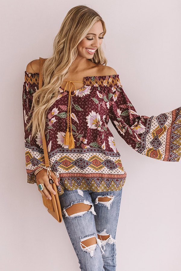 This charming and colorful top is sure to be a "chic delight" with its lightweight material, intricate floral patter, off the shoulder fit with an elastic neckline and a scooped notch with tassel tie string closure, long loose sleeves with flared cuffs, and a relaxed silhouette that falls into a straight hemline! You can style this adorable transitional piece a variety of ways, like with some distressed ankle skinnies and a matching mustard crossbody, or it can be worn with some black flares, our "Say It Ain't Soho Hat in Marigold," and "The Jess Faux Leather Heel in Natural!"