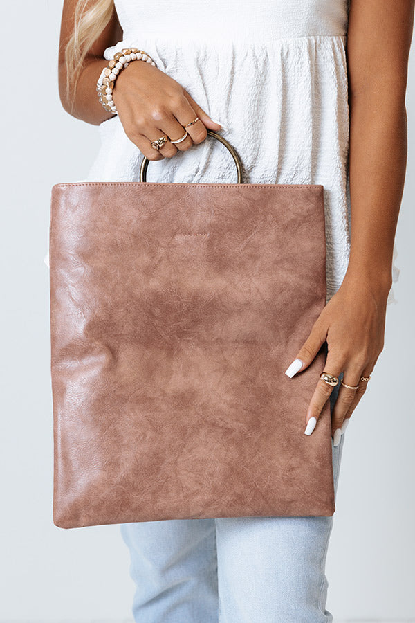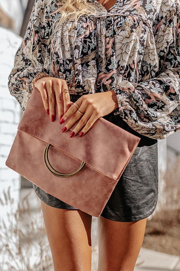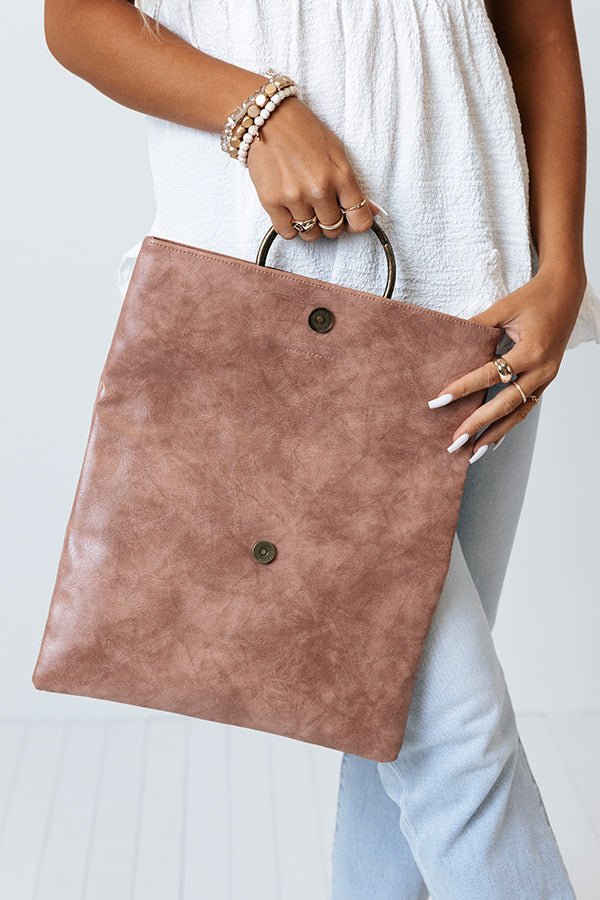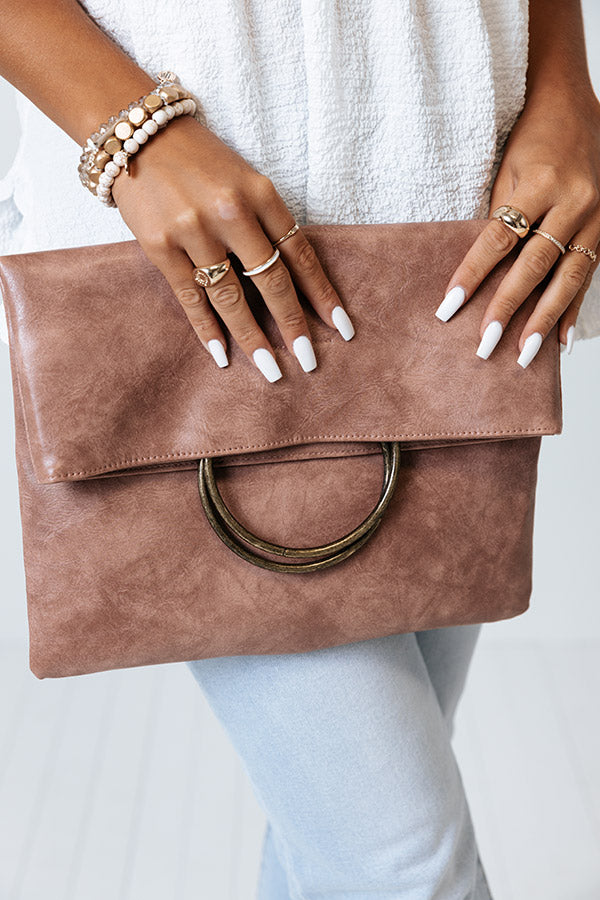Effortlessly look chic with this pretty camel blush clutch featuring lightweight faux leather material, a flap closure with two metal handle accents and a snap button, and a spacious rectangular silhouette that's perfect to just grab and go with!