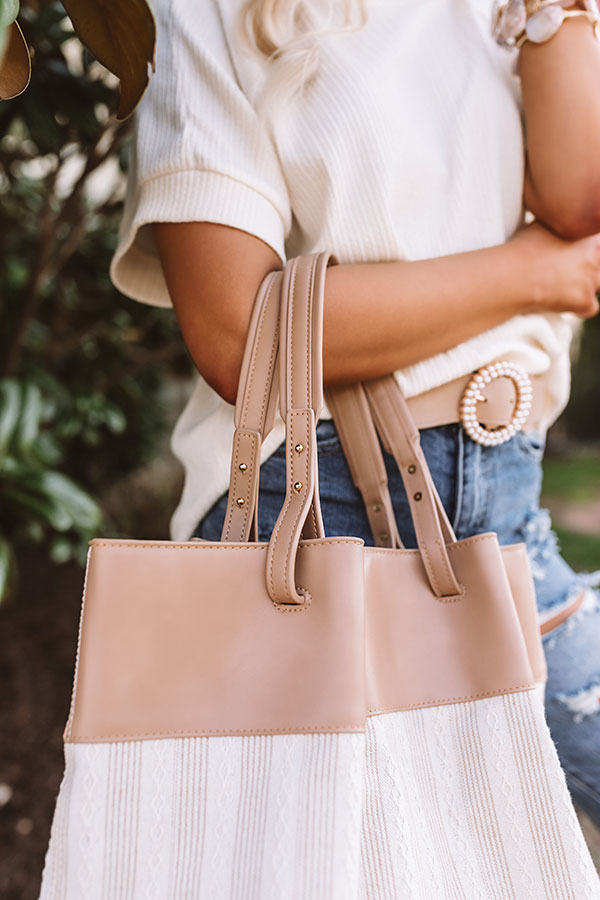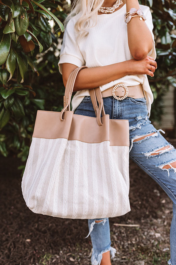 We think you'll agree with us when we say this iced latte colored tote is a "chic essential" with its lightweight canvas material patterned with vertical accent stripes and faux leather on the top, two adjustable handles, and a spacious square shaped pouch with rounded corners!