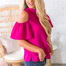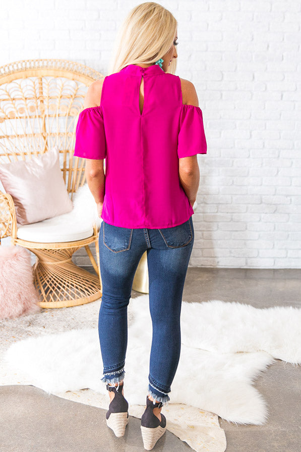 This cold-shoulder cutie is berry fabulous! The "Chic For Sunset Shift Top" has a high neckline, breezy chiffon bodice & open shoulders with flirty flutter sleeves.