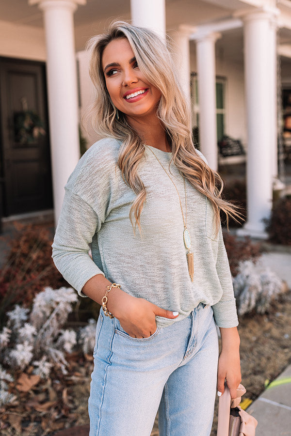 You will undoubtedly look chic forever when you wear this casual cute mint colored top featuring soft lightweight tight knit material, a high neckline, loose 3/4-length sleeves, a single accent chest pocket, and a slouched silhouette that ends in a straight hemline! Measurements