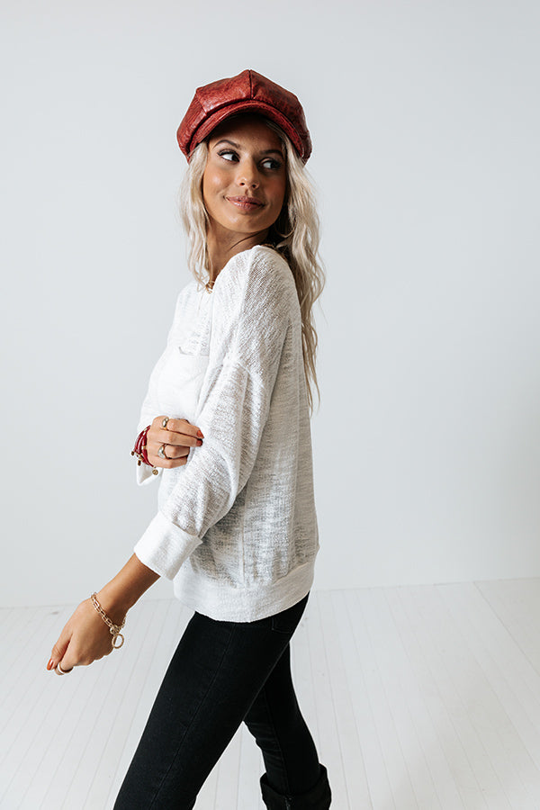You will undoubtedly look chic forever when you wear this casual cute white top featuring soft ultra lightweight tight knit material, a high neckline, loose 3/4-length sleeves, a single accent chest pocket, and a slouched silhouette that ends in a straight hemline!