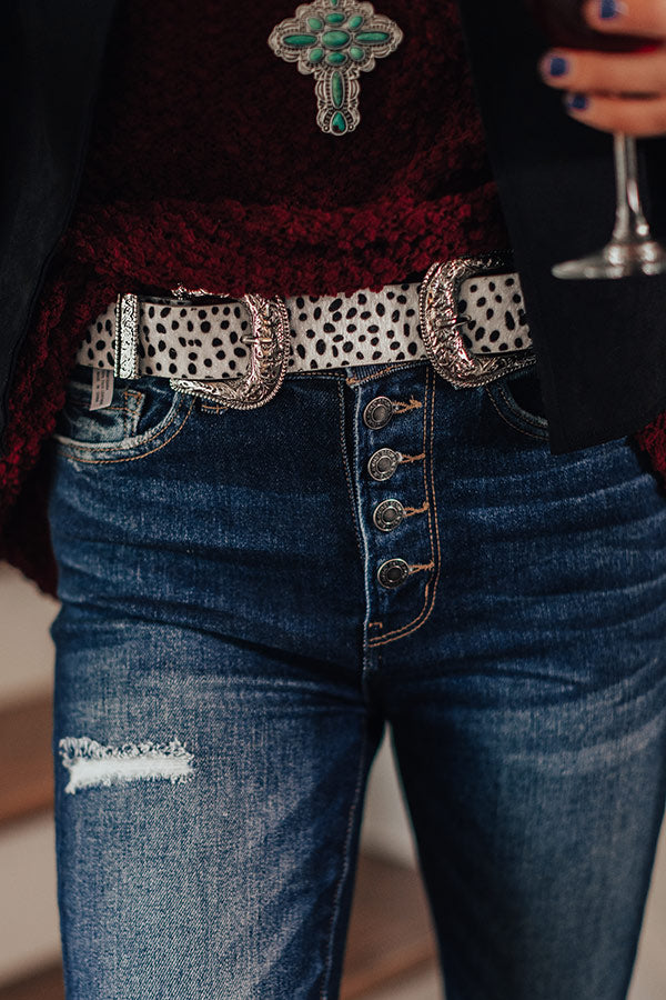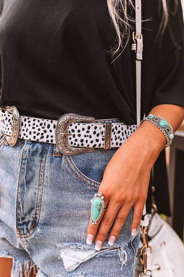 You are sure to look chic when you accessorize with this stunning statement belt featuring a white faux hide strap patterned with a black cheetah print and two large vintage stamped silver buckles!