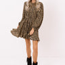 You are guaranteed to look chic in the moment when you arrive in this gorgeous brown dress featuring lightweight flowy material patterned with a small black leopard print, a high rounded neckline, long loose sleeves with elastic band cuffs, a cinched waistline with a tie belt, a keyhole accented upper back with a button closure, and a relaxed skirt silhouette that falls into an uneven mid-thigh length hemline with ruffled detailing!