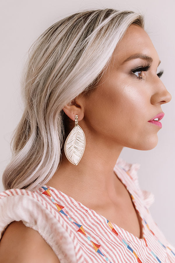 You are sure to look like a "chic islander" when you accessorize with these adorable statement earrings featuring rectangular gold posts with large dangling ivory colored woven leaves!