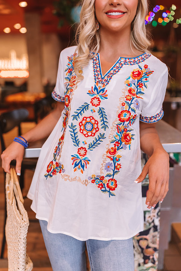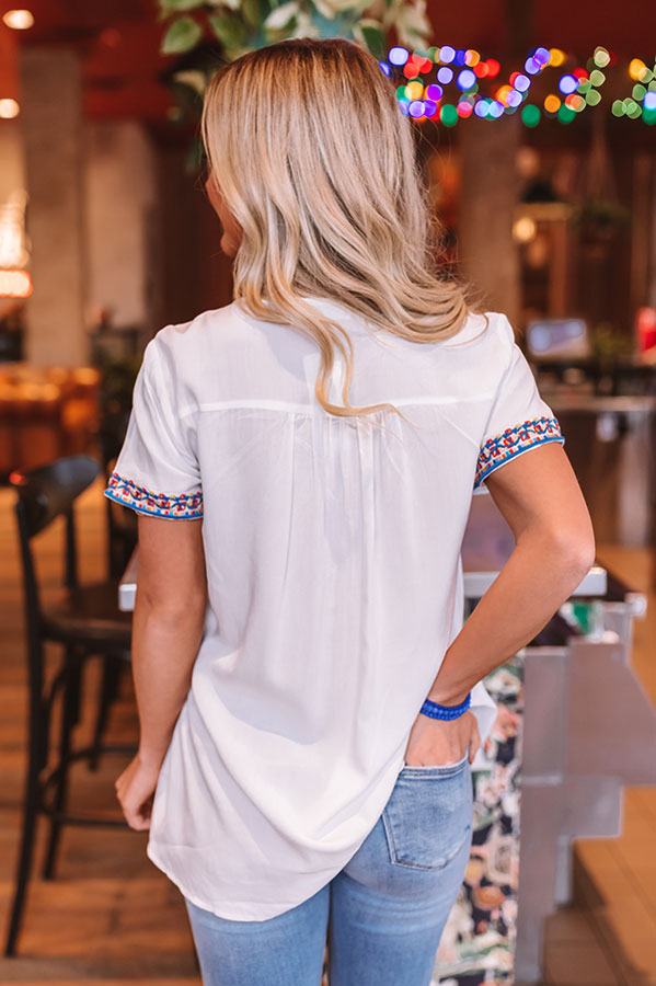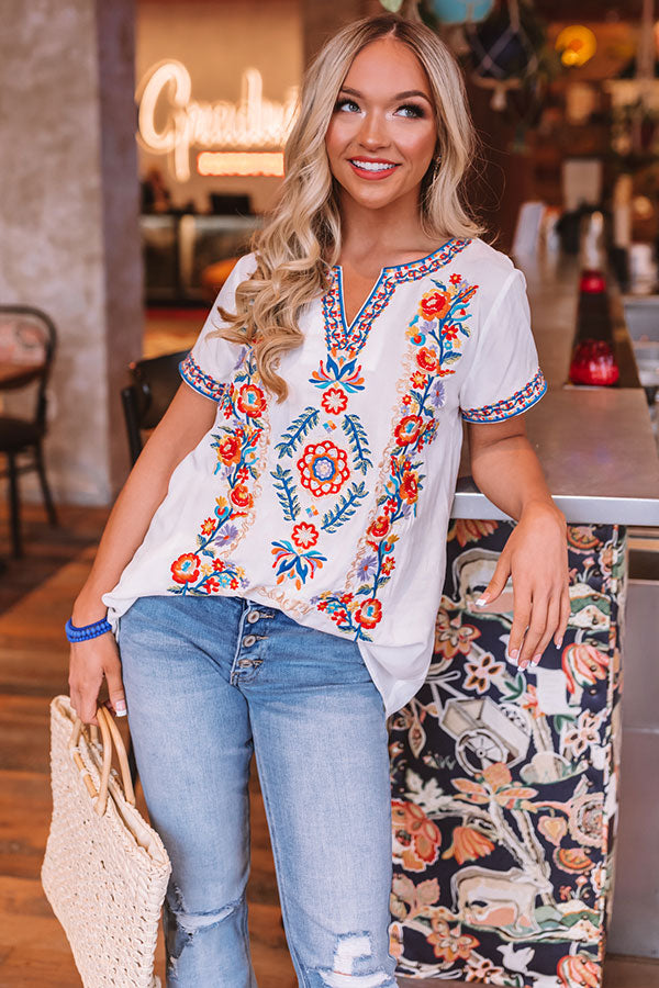 You are sure to look like a "chic islander" when you wear this adorable white top featuring lightweight breezy material patterned with colorful embroidered detailing, a rounded neckline with a v-notched accent, short loose sleeves, and a relaxed silhouette that falls into a rounded hemline! We have styled this intricate piece with some distressed light wash flares, matching red heels, and a woven tote, but you can also wear it with some frayed denim shorts, our "Say It Ain't Soho Hat in Marigold," and "The Brighton Espadrille in Yellow!" Measurements