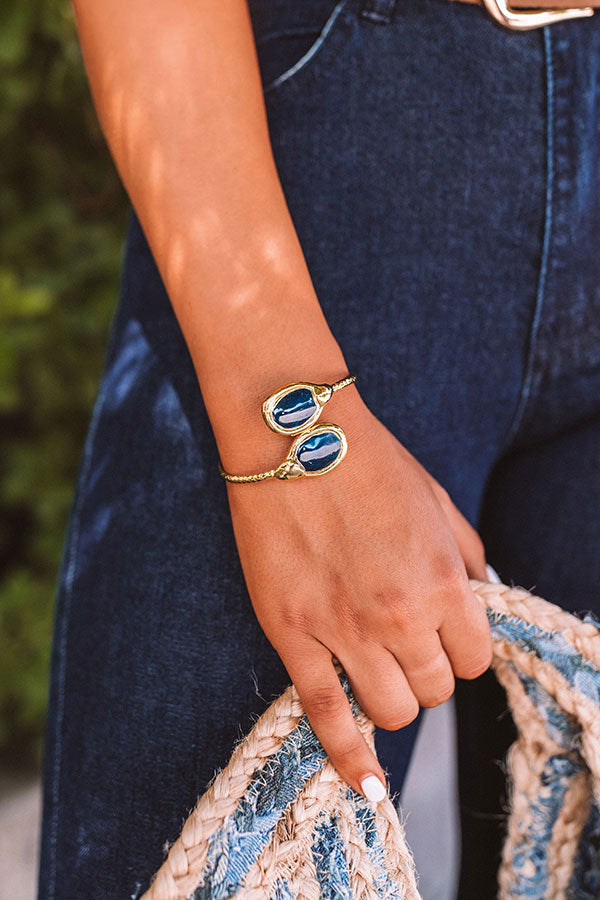Look simple but sophisticated by accessorizing with this chic bracelet featuring a textured gold cuff with two semi precious blue stones! Due to this being a natural stone color variation may vary.