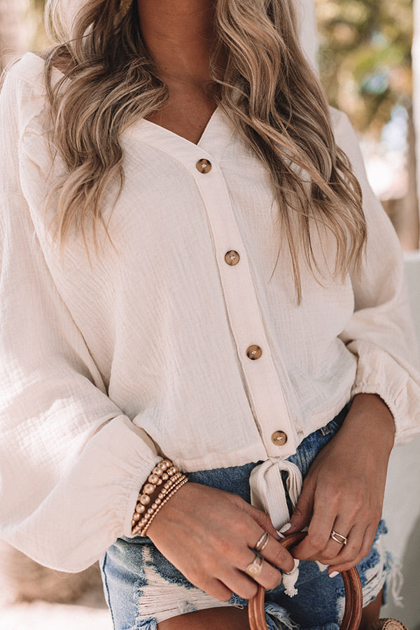 Show up in style with our charming cream colored 'Chic Matters Top' featuring lightweight flowy material with subtle texturing, a button down front with a v-cut neckline, long oversized bubble sleeves with elastic band cuffs, exposed seam detailing, and a slouched but flattering silhouette that falls into a tied front hemline!