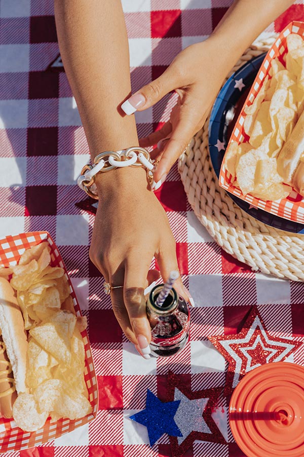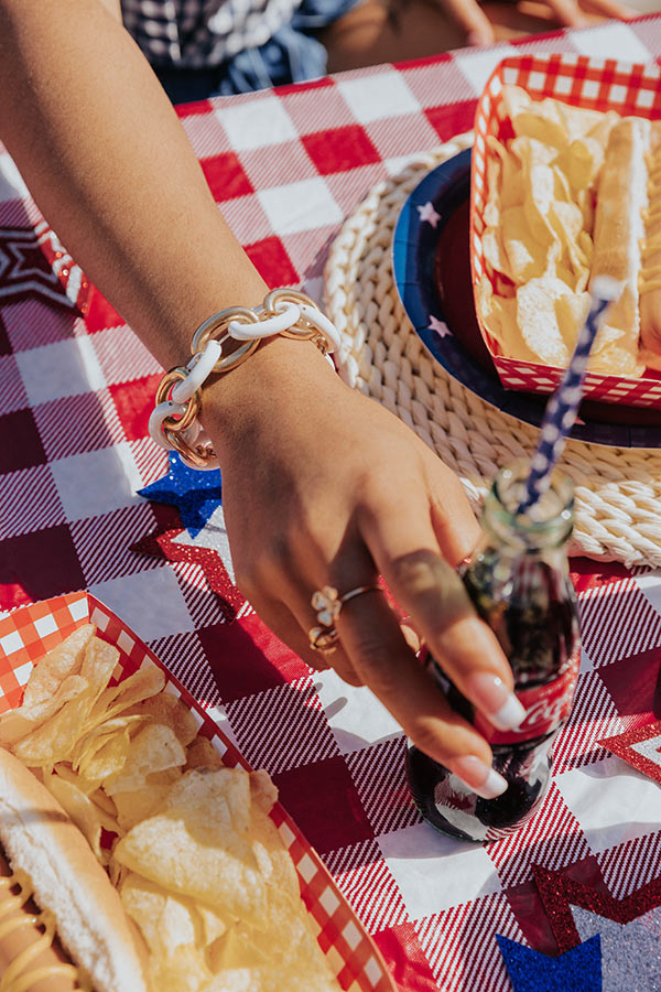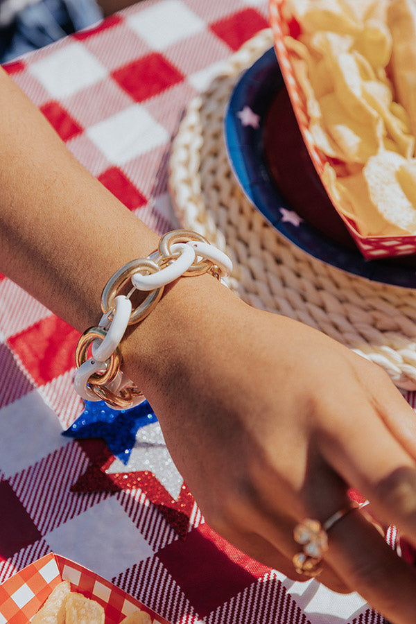 You will undoubtedly look chic on command when you accessorize with this luxe bracelet featuring a large white and gold link chain!