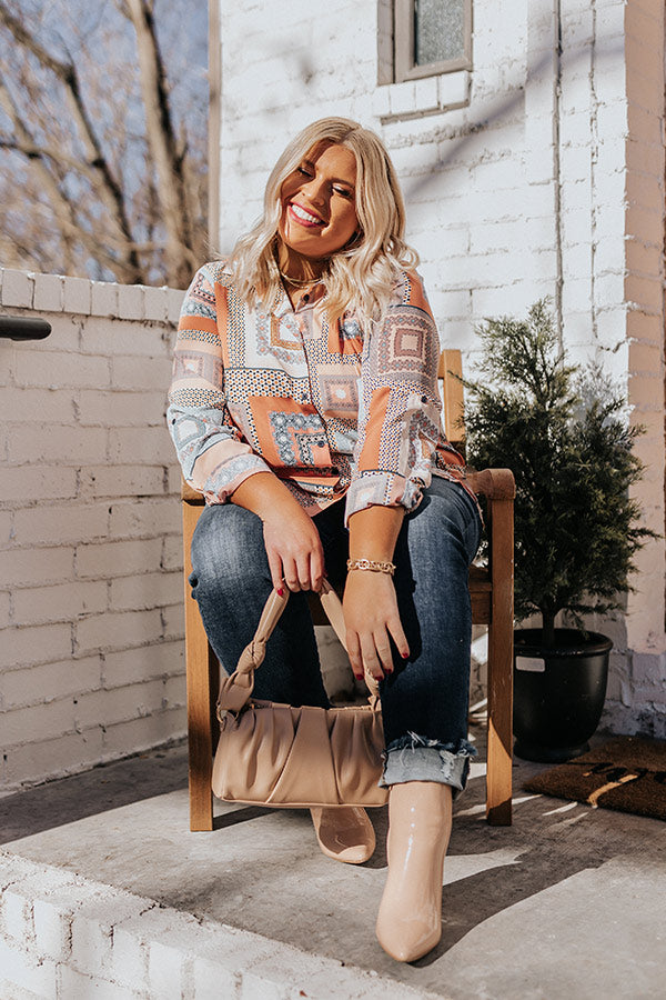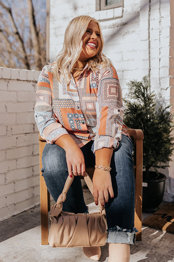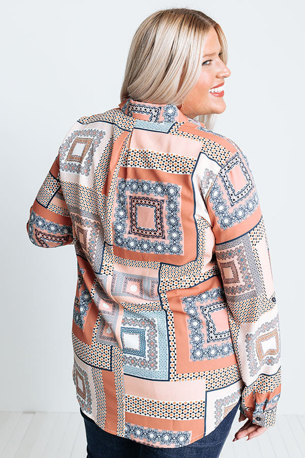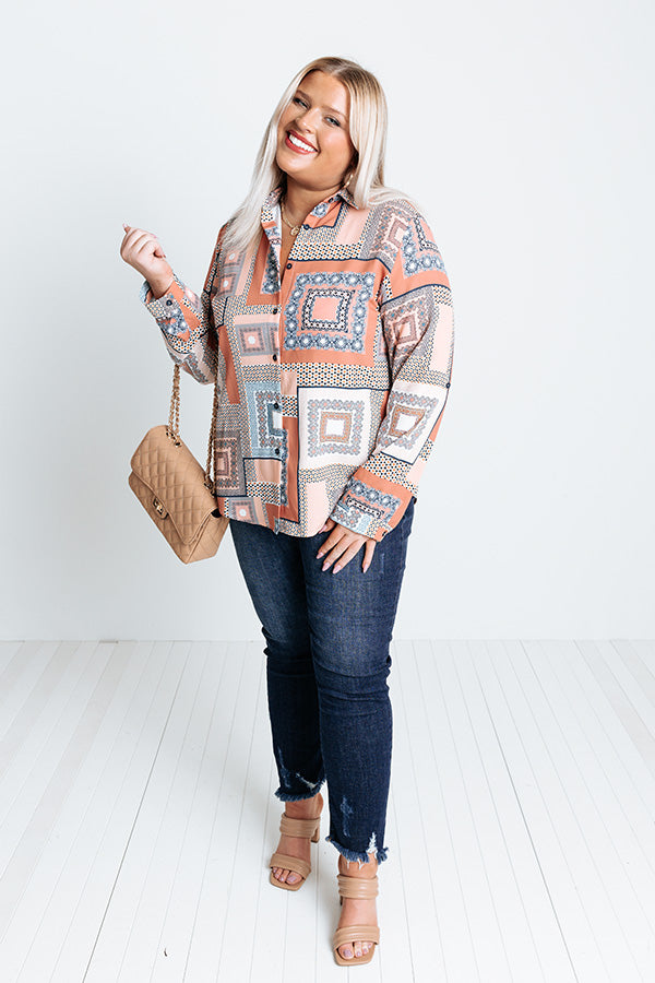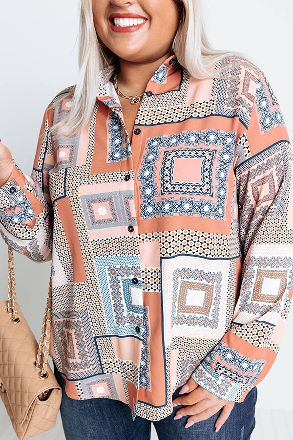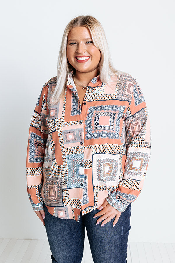 You will look so chic on the scene in this classy plus size top featuring lightweight material patterned with an intricate rust and light blue hued print, a button up front with a collared neckline, long loose sleeves with button closure cuffs, and a relaxed silhouette that falls into a rounded hemline!