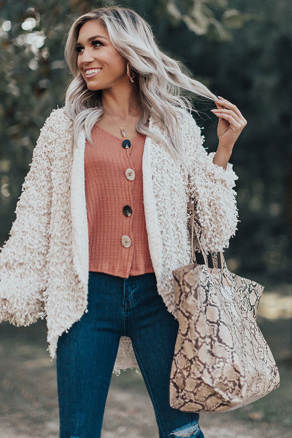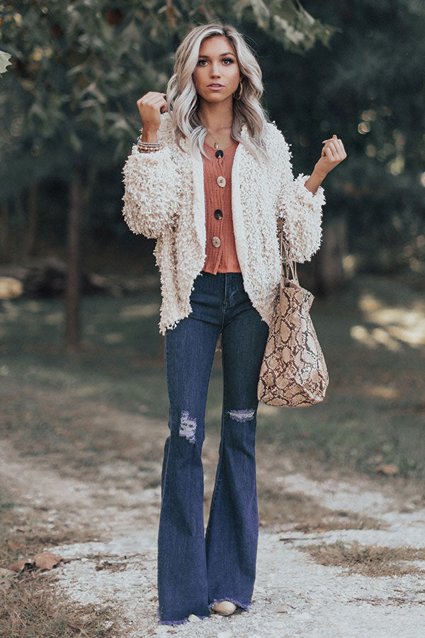 Layer up in style for the chilly fall season with our adorable ivory colored "Chic Peek" jacket featuring lightweight loose knit material with popcorn fringe texturing, long oversized sleeves with fitted cuffs, and a relaxed open front silhouette that falls into a rounded tunic length hemline! You can pair this ultra warm and versatile piece with just about anything from a basic tank to a bodysuit or dress, jeans to shorts or skirts, booties to wedges or sandals, clutches to totes, and hats to earrings! Measurements