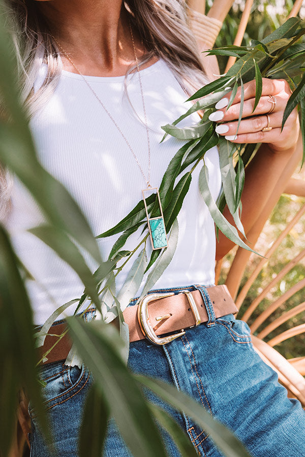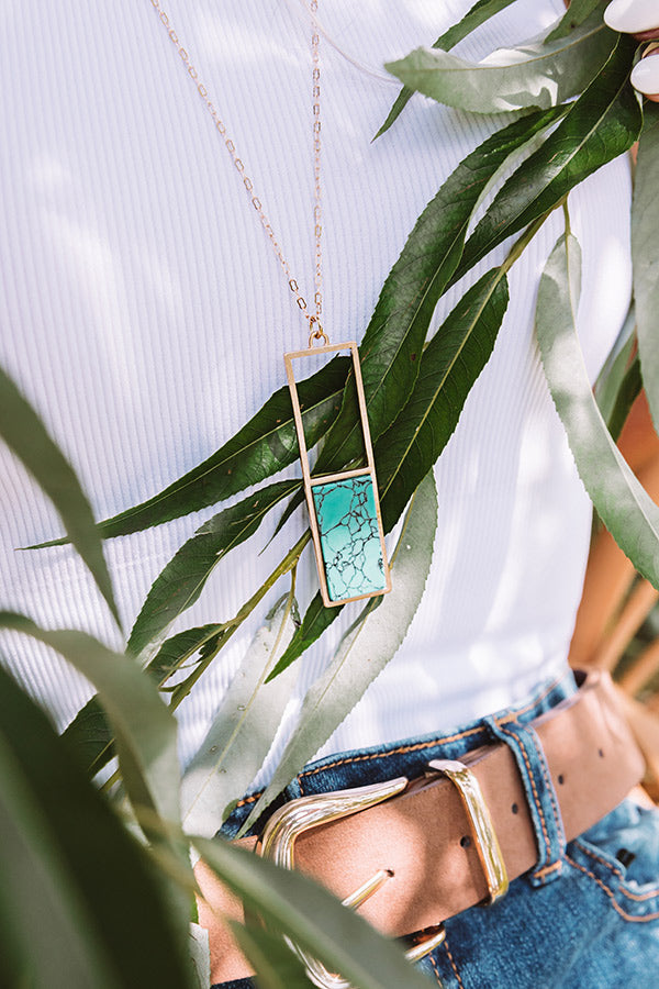 You are sure to catch some attention when you accessorize with our adorable "Chic Seascape" statement necklace featuring a dainty gold chain and a large open rectangle silhouette with a turquoise faux stone bottom half!