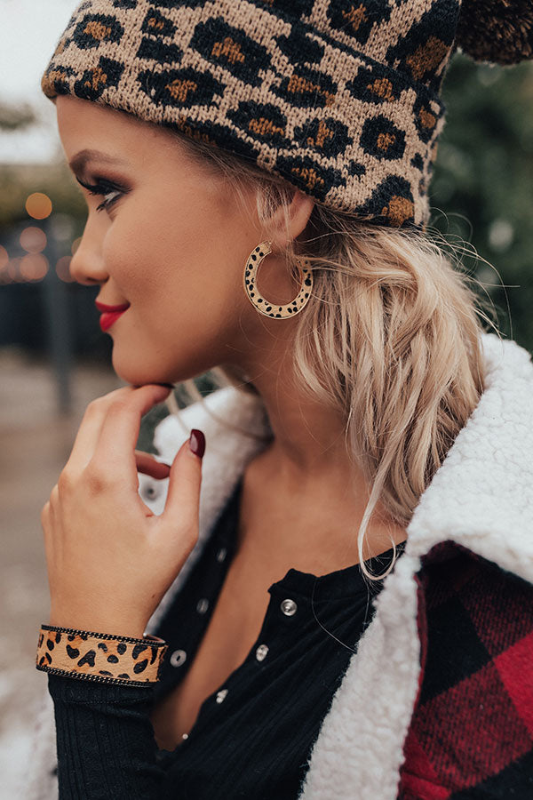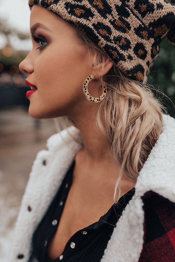 You're sure to be the envy of every outing when you accessorize with our tan "Chic Selection" statement earrings featuring wide open hoops patterned with a bold black cheetah print!