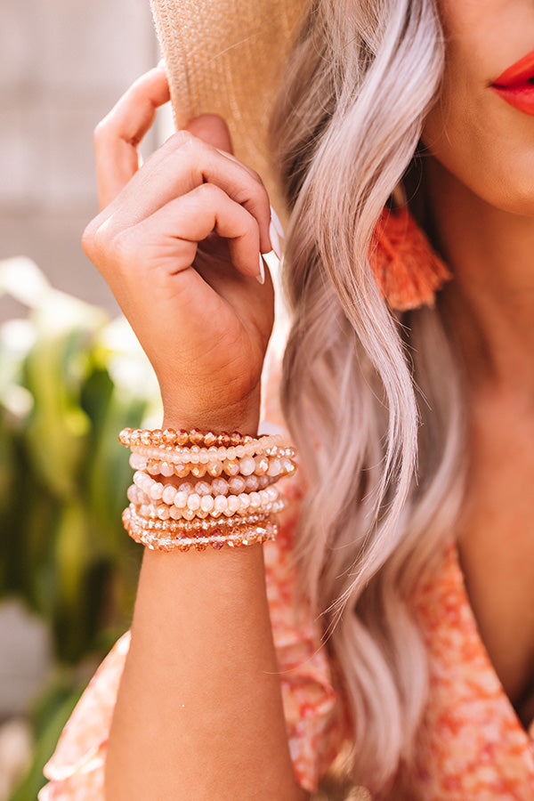 Add a "chic sensation" to your OOTD with this darling bracelet set featuring nine champagne colored beaded pieces!