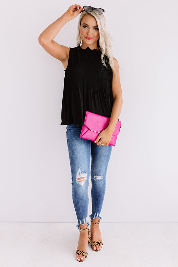 You are sure to be a "chic showstopper" when you wear this darling black top featuring lightweight breezy material with pleated detailing, a high rounded neckline with oversized ruffled accent trim, wide 3-inch sleeveless shoulder straps, a keyhole accented upper back with a button closure, and an ultra relaxed silhouette that falls into an uneven hemline! We have styled this chic piece with some distressed ankle skinnies, sunnies, leopard wedges, and a hot pink clutch, but you can also wear it layered under a denim jacket with some frayed white shorts and our "Five Star Jute Wedge in Black!" Measurements