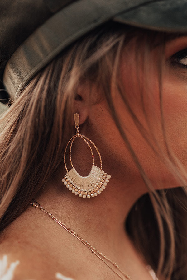 You are sure to catch everyone's attention by accessorizing with our 'Chic Signal' statement earrings featuring dainty dangling gold oval hoops with an ivory colored fan and beaded detailing!