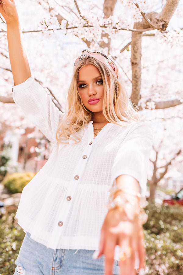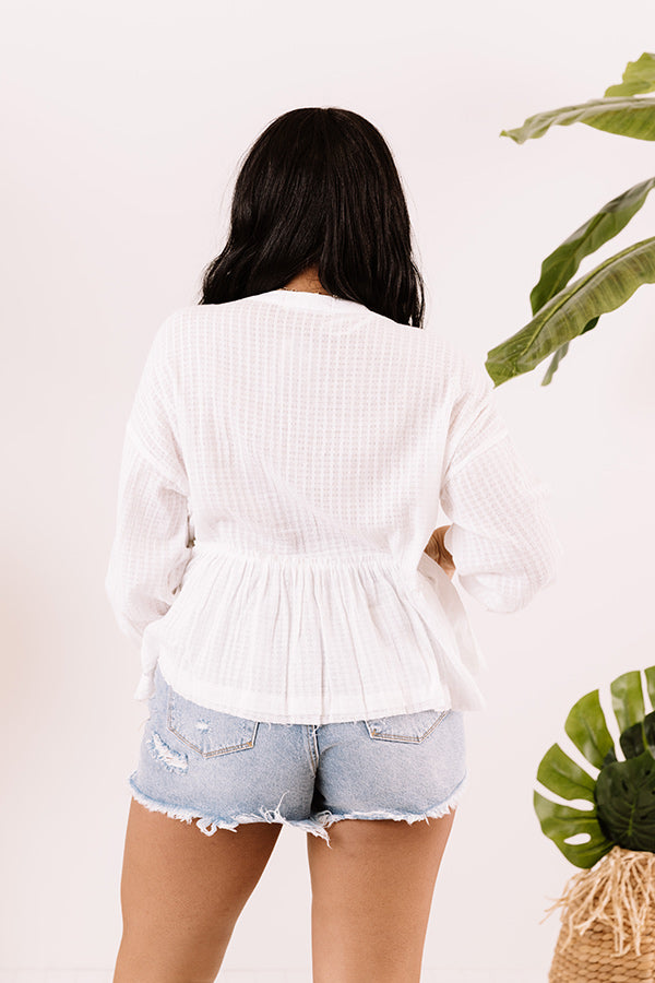 Step up your style game with our white 'Chic Soleil Shift Top' featuring lightweight breezy material patterned with wide waffle knit texturing, a button down front with a high rounded neckline, loose half sleeves with button closure cuffs, and a relaxed silhouette that falls into a peplum bottom with a rounded raw cut hemline! Measurements