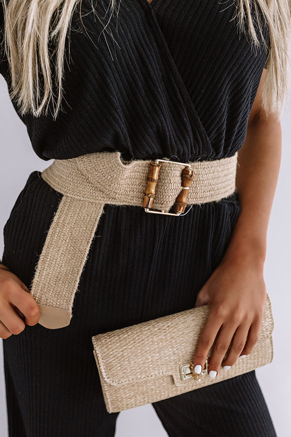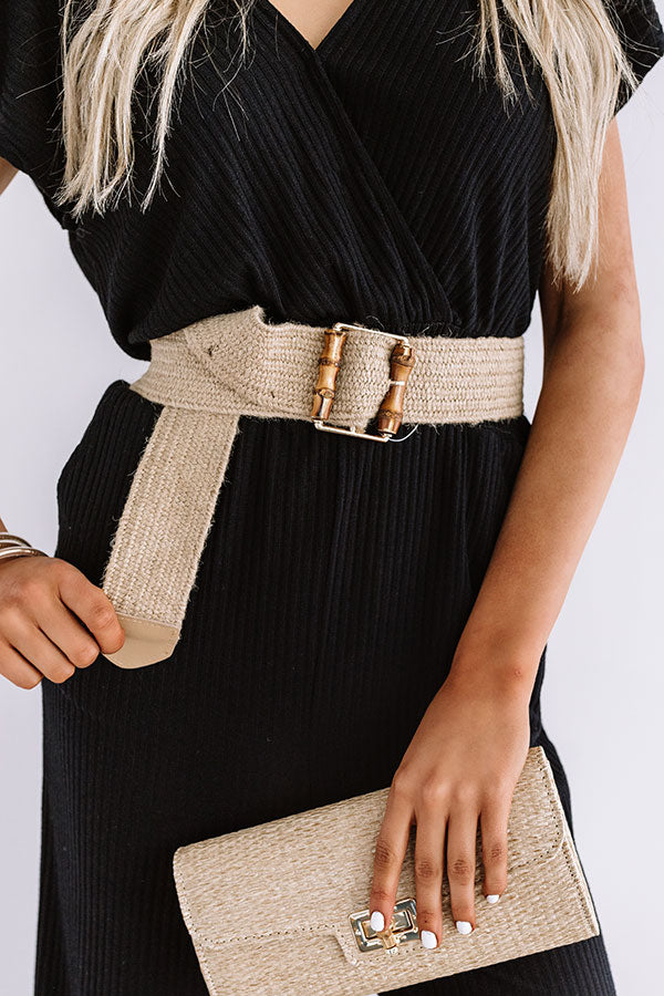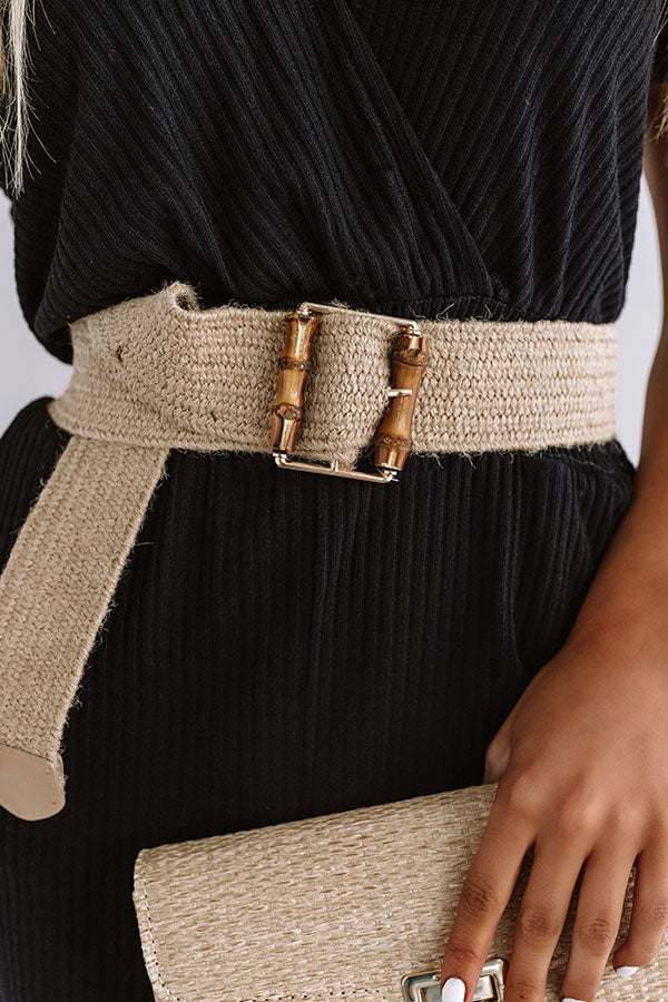 You are sure to step up your style game when you accessorize with our khaki colored "Chic Soleil" belt featuring a wide woven band and a large rectangular gold buckle!