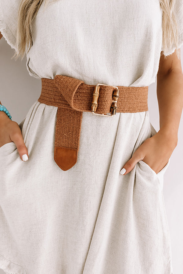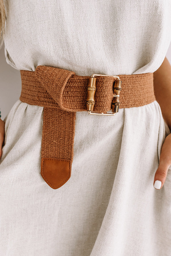 You are sure to step up your style game when you accessorize with our maple colored "Chic Soleil" belt featuring a wide woven band and a large rectangular gold buckle!