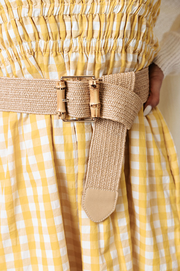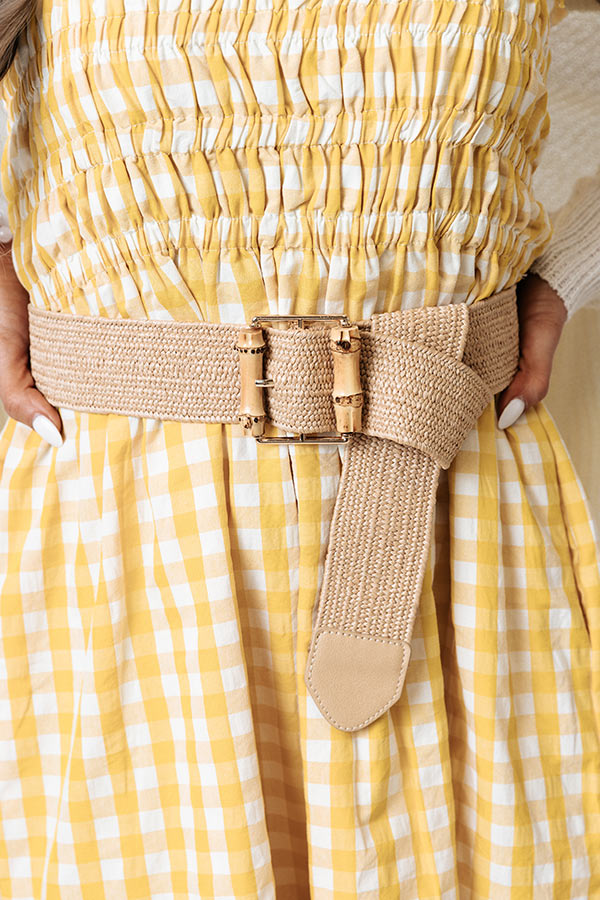 You are sure to step up your style game when you accessorize with our tan colored "Chic Soleil" belt featuring a wide woven band and a large rectangular gold buckle!