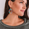 You will have chic jewelry style when you wear these intricate dangley earrings featuring multi colored woven string inside an abstract golden oval hoop!