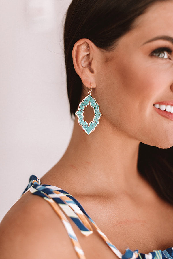 You will have chic jewelry style when you wear these intricate dangley earrings featuring turquoise woven string inside an abstract golden oval hoop!