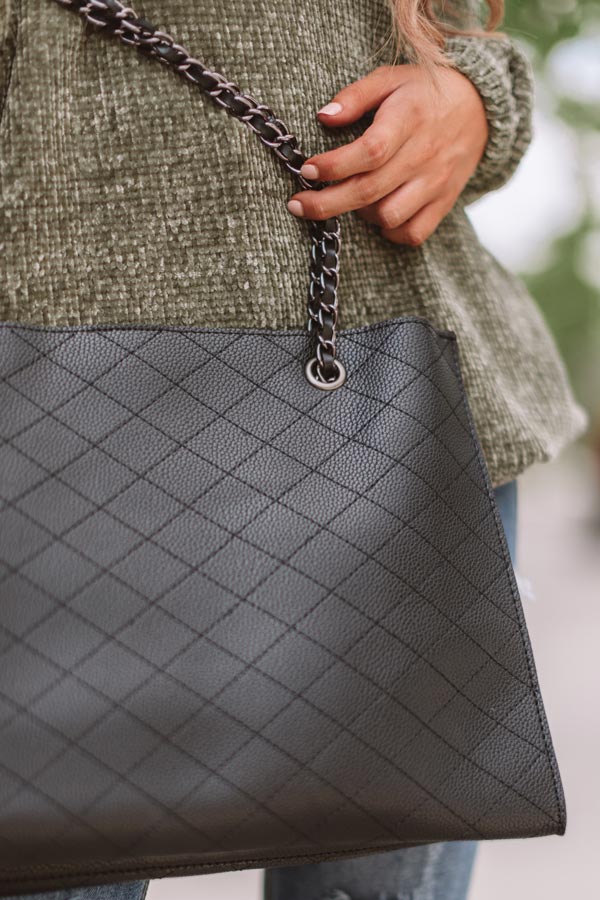 Show off your "chic success" in this black tote featuring faux leather material, a checkered texture, chain link tote handles, a spacious pocket with a snap closure, and a removable zippered pouch!