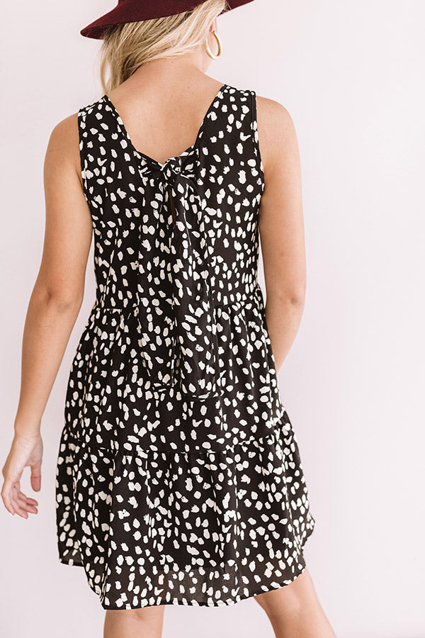 Show off your "chic success" in this black shift top featuring a bold black leopard pattern, lightweight material, wide sleeveless straps, a v-cut neckline and open back with a tie closure, and a relaxed silhouette that falls into a tiered skirt with a mid-thigh length uneven hemline! We have styled this gorgeous transitional piece under a denim jacket with a black peep toe bootie and a faux suede hat, but you can also add a pop of color with "The Darcy Heel in Blush" and our "Brooklyn Happy Hour Faux Suede Clutch in Pink!" Measurements