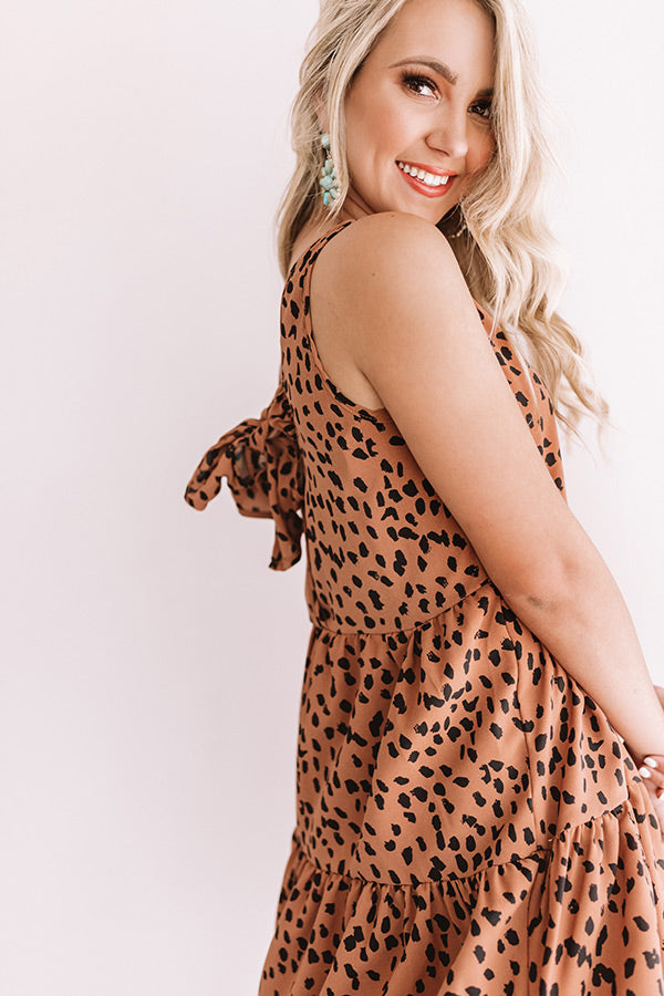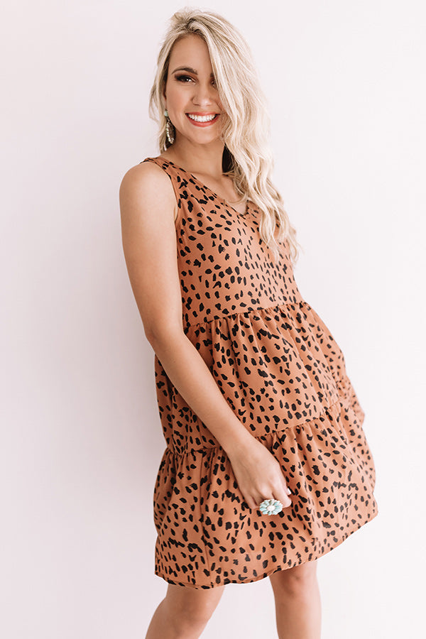 Show off your "chic success" in this brown shift top featuring a bold black leopard pattern, lightweight material, wide sleeveless straps, a v-cut neckline and open back with a tie closure, and a relaxed silhouette that falls into a tiered skirt with a mid-thigh length uneven hemline! We have styled this gorgeous transitional piece with a black peep toe bootie and turquoise statement jewelry, but you can also add a pop of color with "The Darcy Heel in Blush" and our "Brooklyn Happy Hour Faux Suede Clutch in Pink!" Measurements