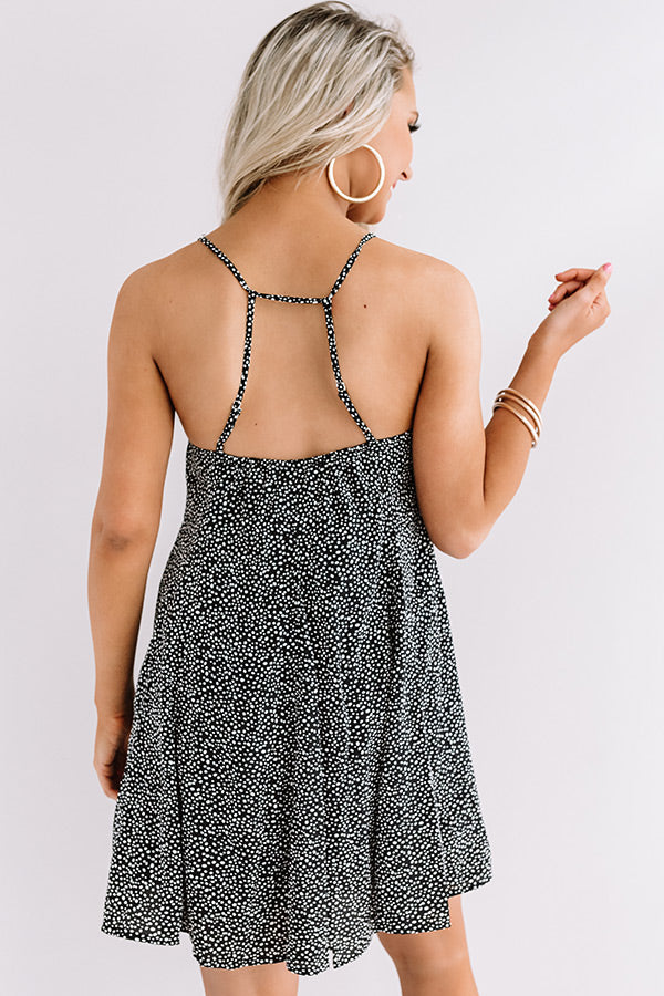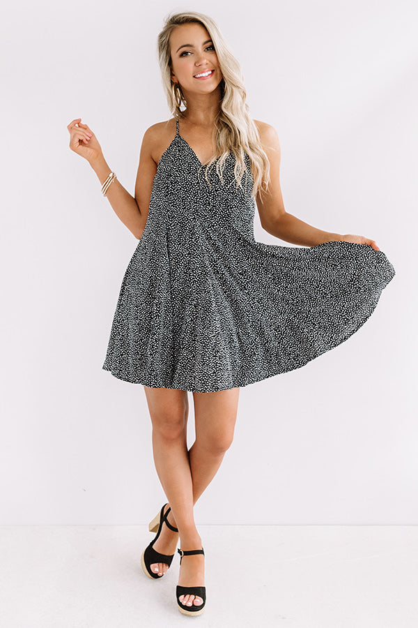 Life is a party, so dress like it in our black "Chic Surroundings Shift Dress" featuring lightweight breezy material patterned with subtle white polka dots, a v-cut neckline, spaghetti straps that form an open and twisted racerback fit, and a relaxed silhouette that falls into an uneven mid-thigh length hemline! We have styled this cutie with a black heel, belt, and bucket bag, but you can also wear it layered under a cropped denim jacket, "The Lilianna Faux Suede Wedge in Red," and our "Mimosa Party Cat Eye Sunnies in Red!" Measurements