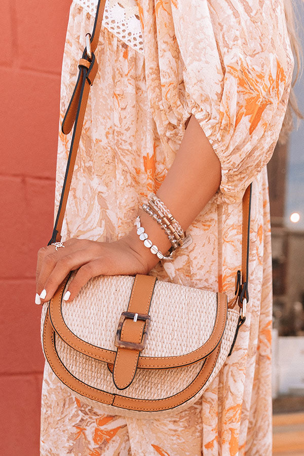You will surely be labeled as chic when you accessorize with this stunning crossbody featuring lightweight woven material with brown faux leather detailing, a flap closure with a buckle accent, an adjustable shoulder strap, and a spacious rounded pouch with additional inside accent pockets!