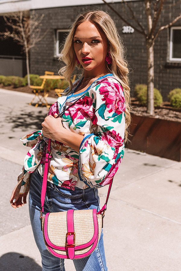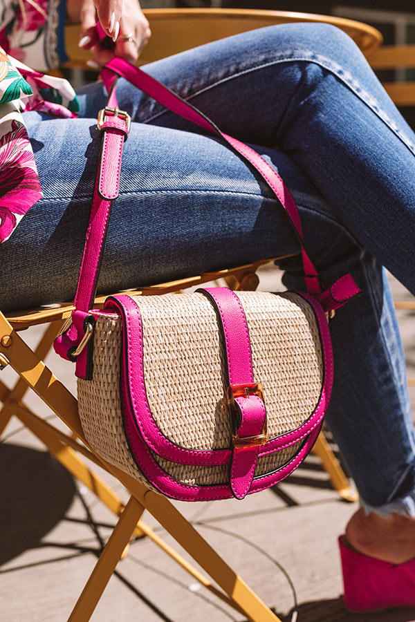 You will surely be labeled as chic when you accessorize with this stunning crossbody featuring lightweight woven material with fuchsia colored faux leather detailing, a flap closure with a buckle accent, an adjustable shoulder strap, and a spacious rounded pouch with additional inside accent pockets!