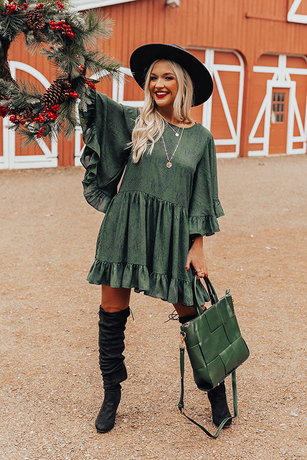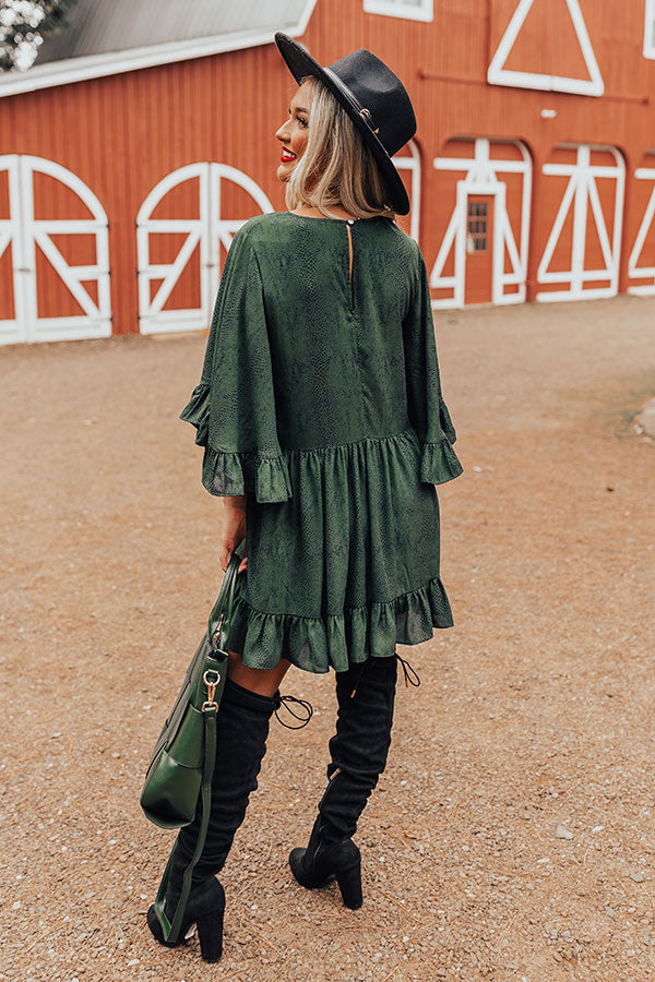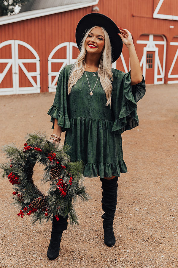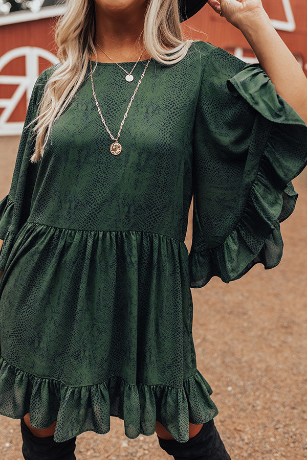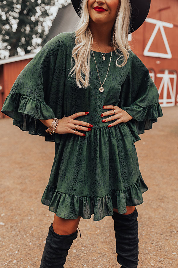 You will look like one chic sweetheart when you arrive in this darling hunter green shift dress featuring lightweight flowy material patterned with a subtle snake print, a rounded neckline, loose 3/4-length sleeves with oversized ruffle trim detailing, a keyhole accented back with a button closure, and a relaxed silhouette that falls into a ruffled mid-thigh length hemline!