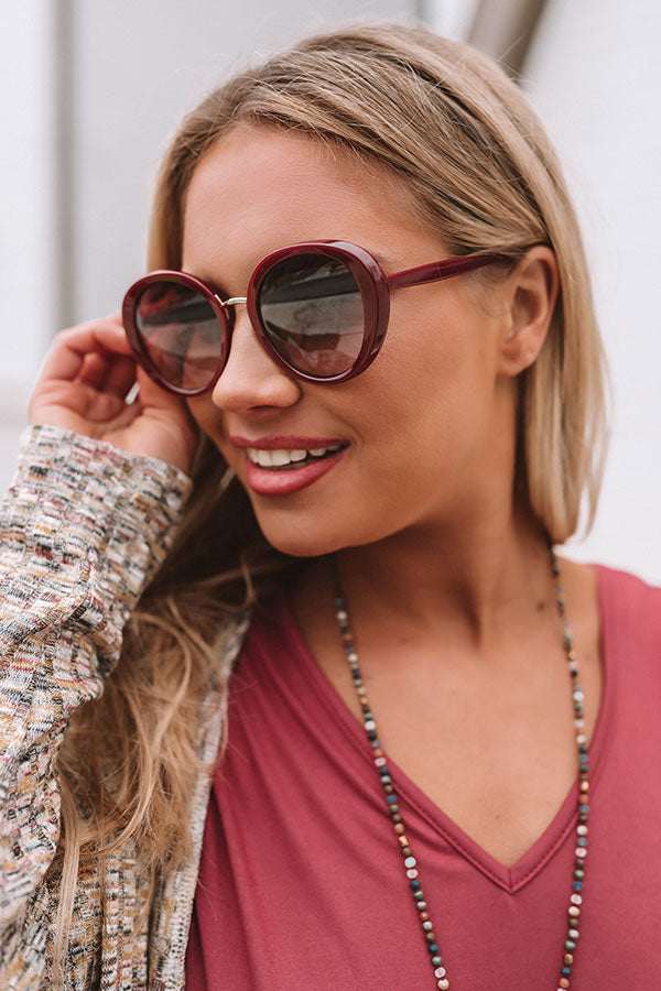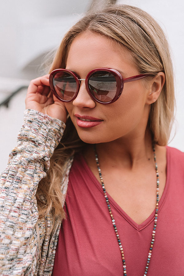 There is no better way to look chic on the weekend than by accessorizing with these adorable statement sunnies featuring thick rounded wine colored circle frames, a gold nose bridge, and dark tinted lenses!