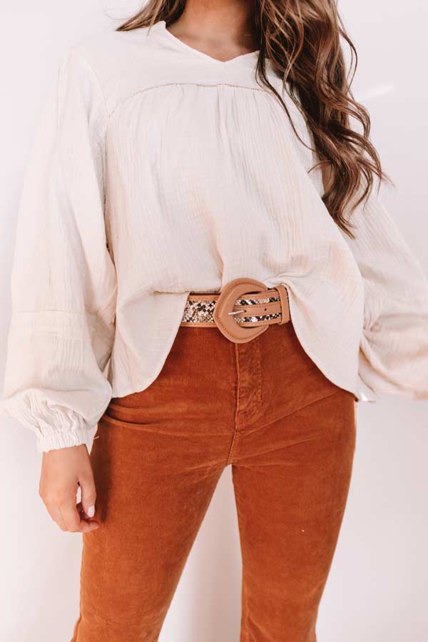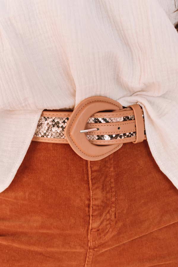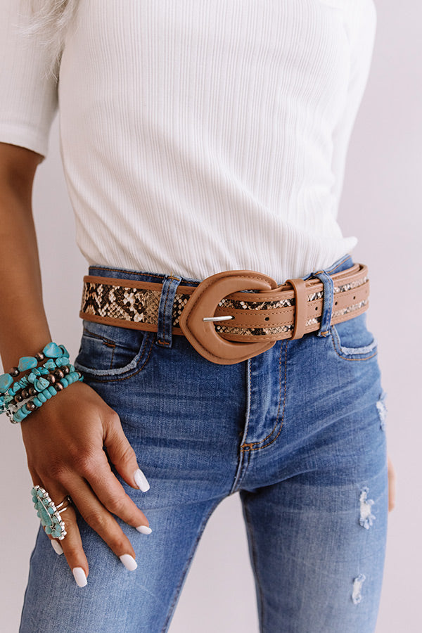 There is no better piece to tie your OOTD together with than our "Chicest Of Times" statement belt featuring a faux suede snake print band with a neutral trim and large buckle!