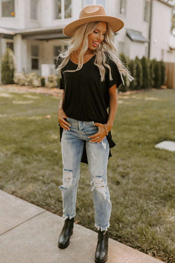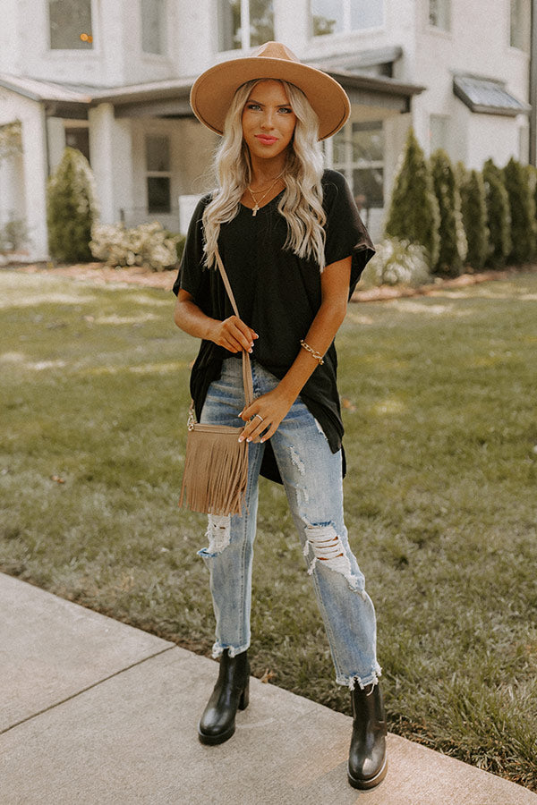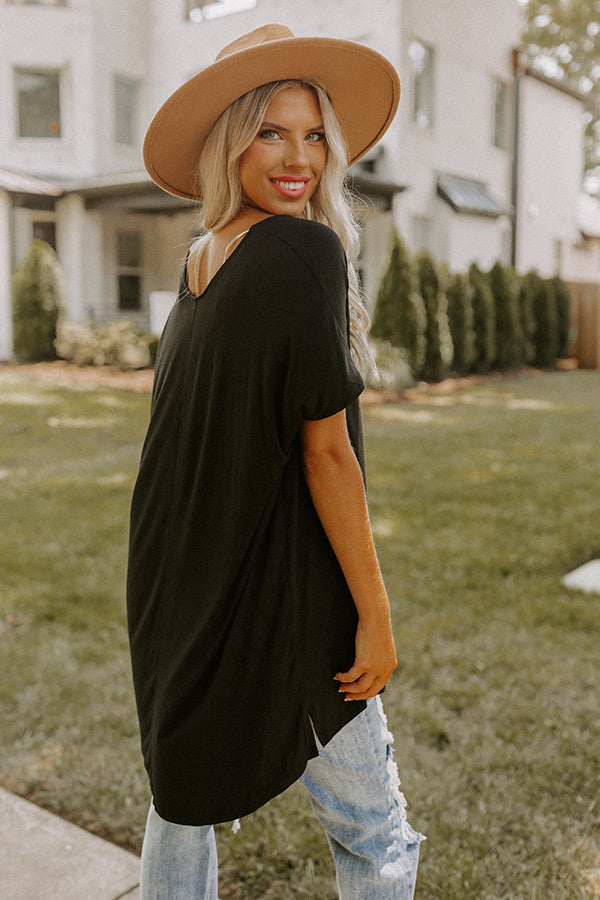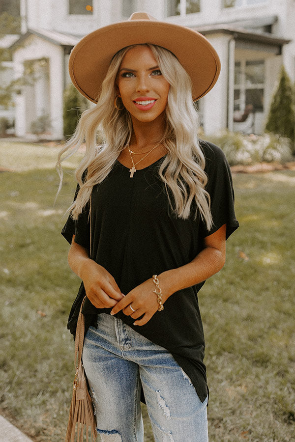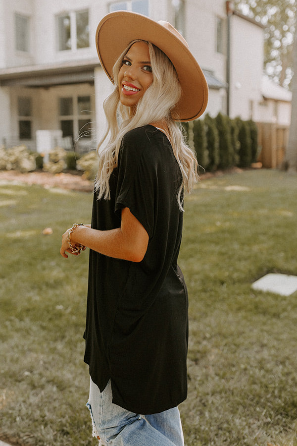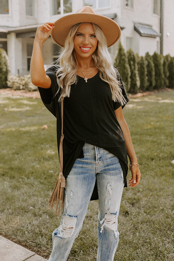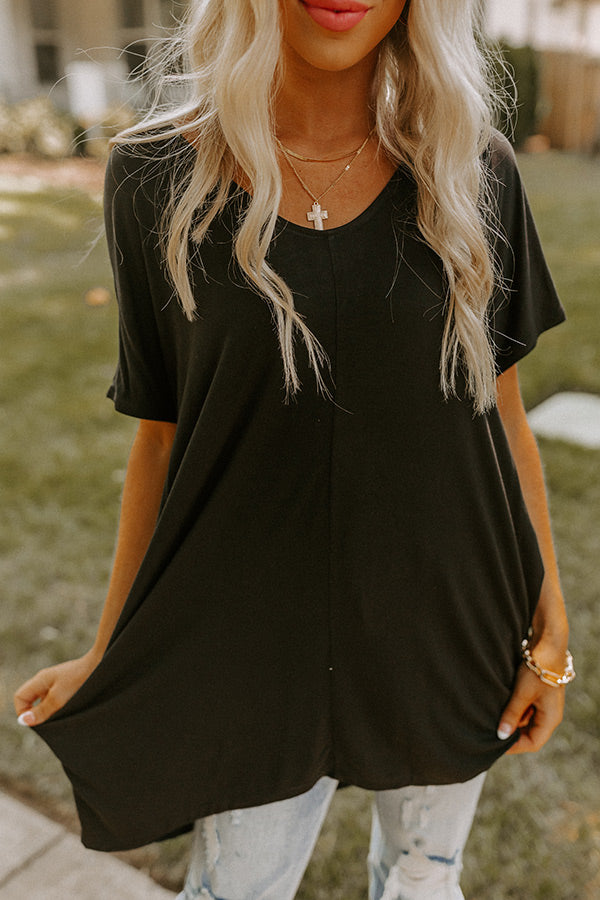 The perfect weekend piece, our black 'Chill On The Horizon Shift Top' features soft lightweight material, a rounded neckline, loose short sleeves, and a slouched silhouette that ends in a rounded hemline!