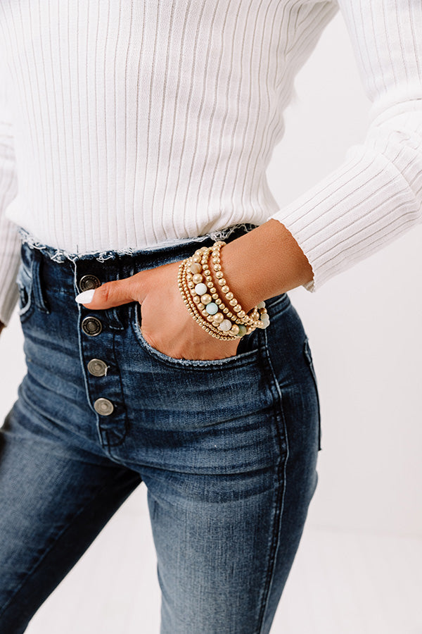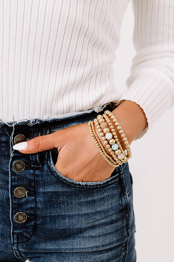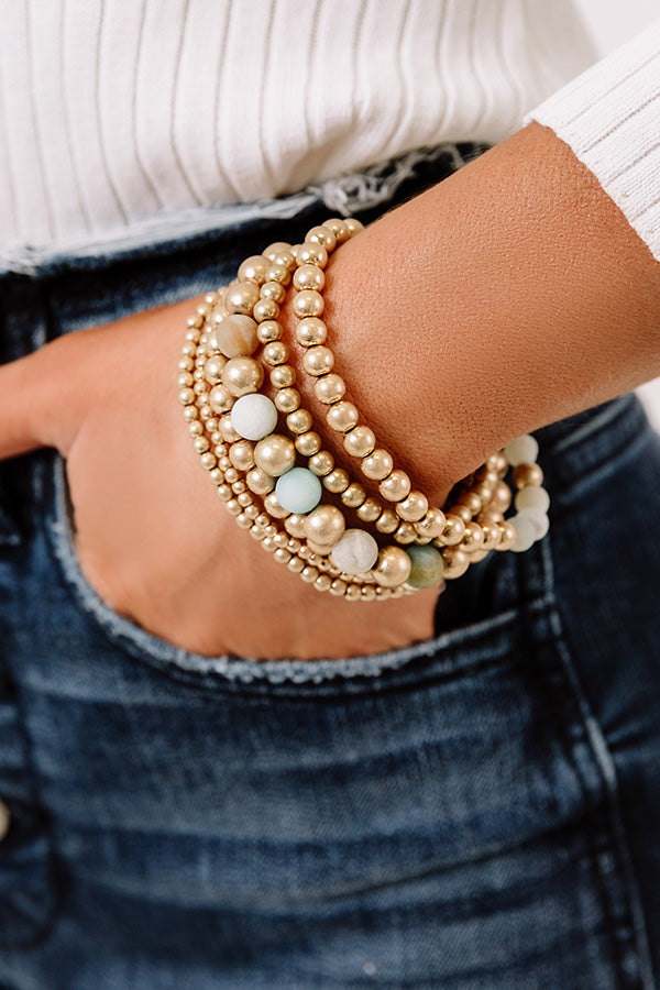 Add a chill touch to any look with this adorable bracelet set featuring six gold and sea glass hued beaded stretch pieces!
