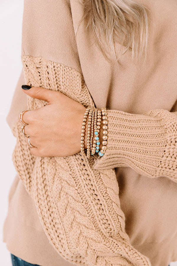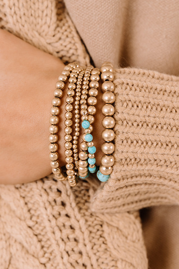 Add a chill touch to any look with this adorable bracelet set featuring six gold and turquoise beaded stretch pieces!