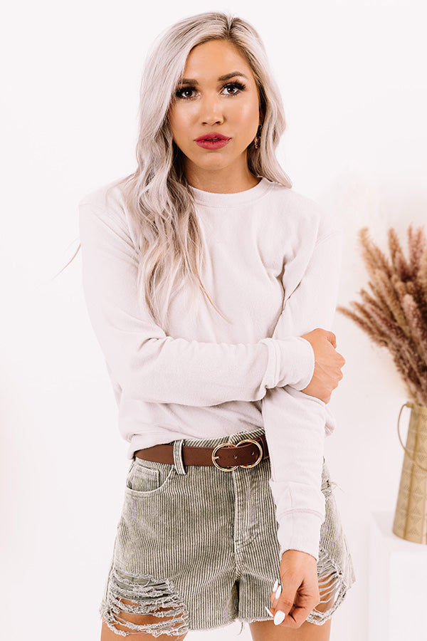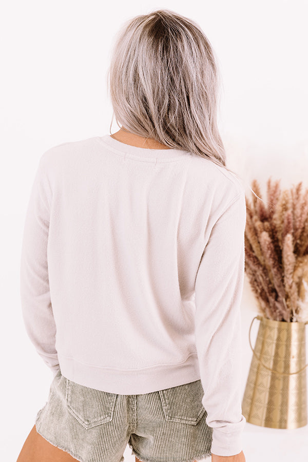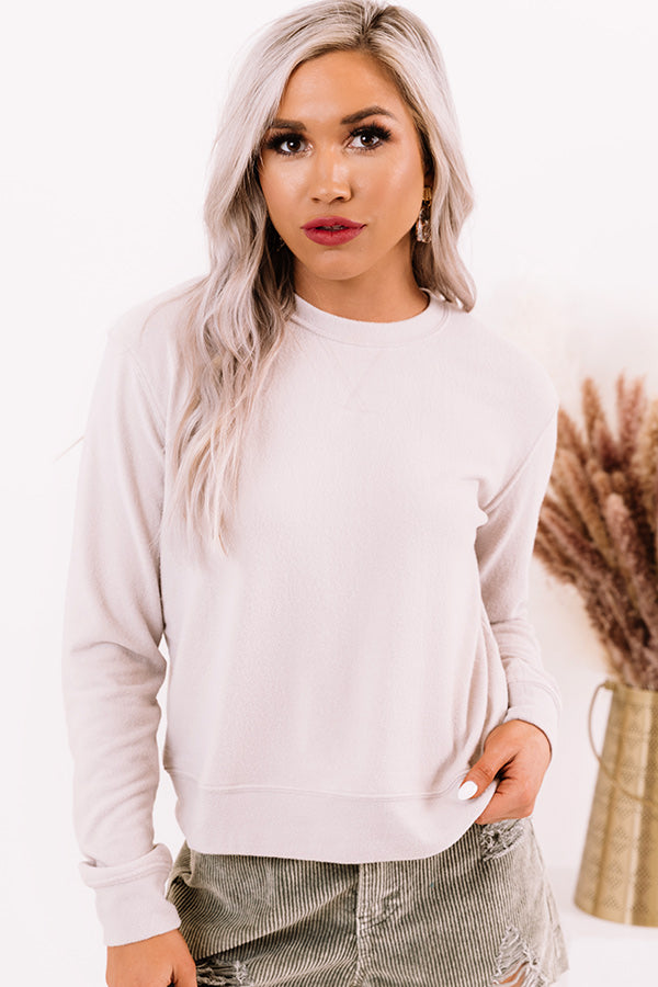Keep your galentine's OOTD chill with this simple stone colored sweatshirt featuring soft lightweight material, long loose sleeves with fitted cuffs, a high rounded neckline, and a slouched silhouette that ends in a straight hemline! Measurements