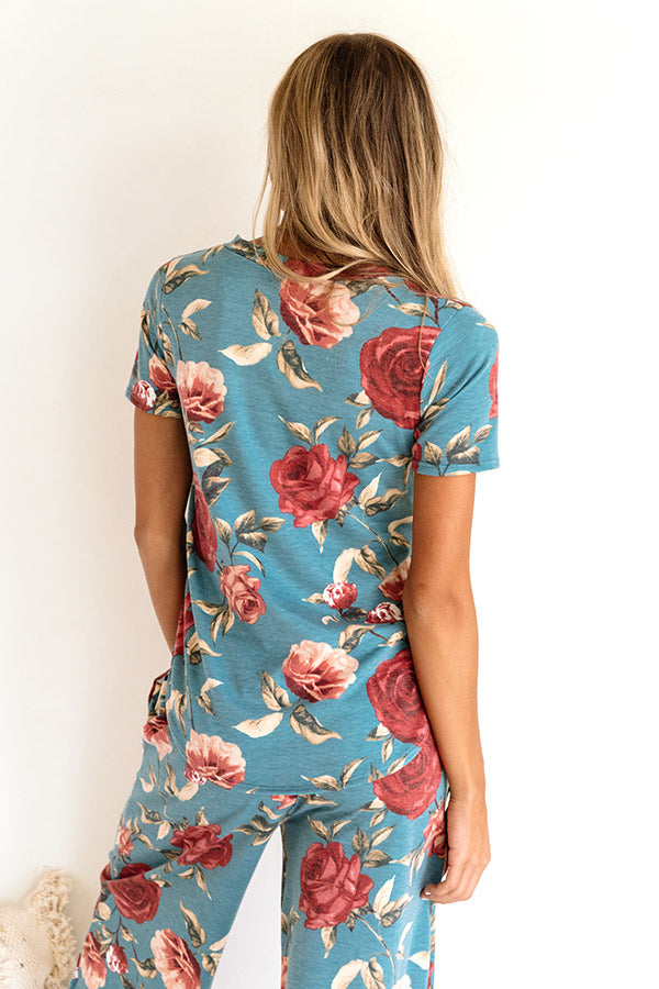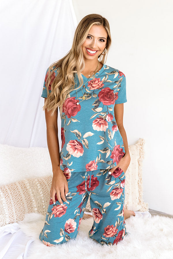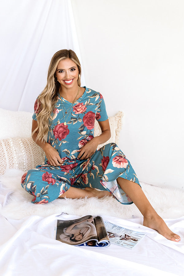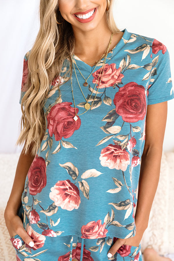 Enjoy a "chill weekend" in this adorable blue shift tee featuring ultra soft lightweight material patterned with a bold blush hued floral print, a high v-cut neckline, short loose sleeves, and a relaxed silhouette that falls into a straight hemline! This comfy piece styles perfectly with our matching "Chill Weekend Floral Pants," a scrunchie, and some fuzzy slippers for the ultimate two-piece lounge look!