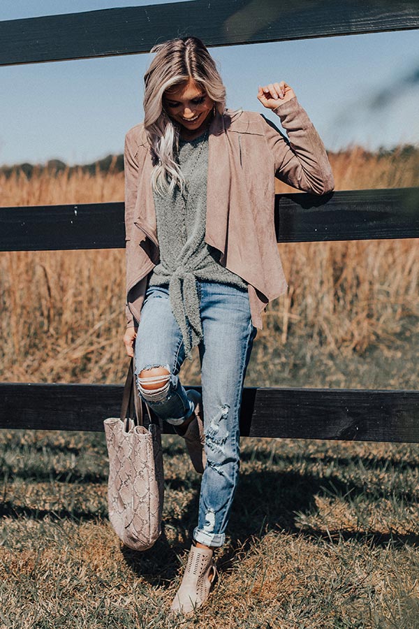 We guarantee this taupe jacket will keep you from getting "chills in Chicago" with its warm faux suede material, lightweight fit, long sleeves, a draped open flap front with a zip closure, and a straight fit bodice that falls into an uneven hemline! We have styled this piece over a simple waffle knit shirt with some distressed ankle skinnies, a neutral bootie, and a fringe crossbody, but you can also pair it with a basic grey tank, our "Sweet Victory High Waist Corduroy Skirt in Wine," a faux suede hat, and "The Seraphina Faux Leather Wedge in Grey!" Measurements