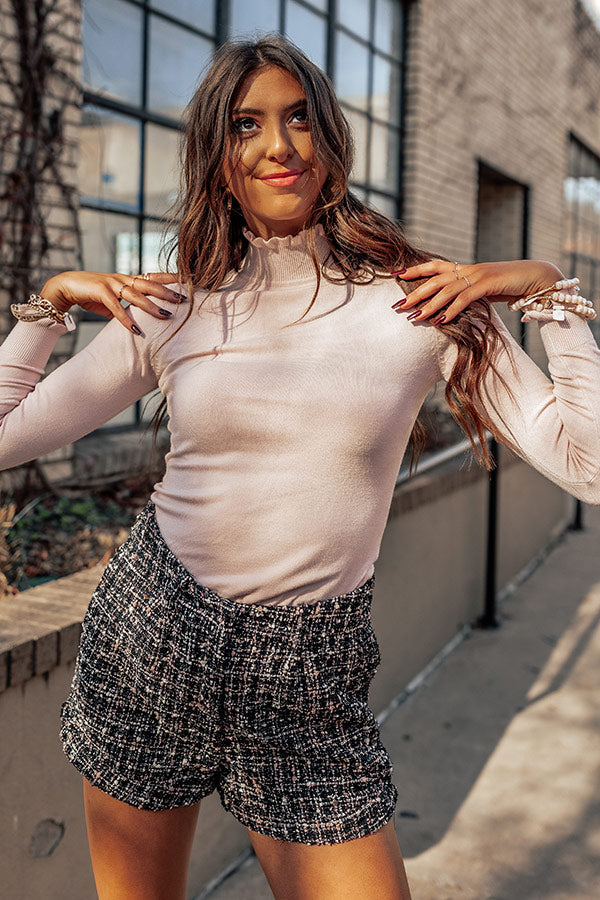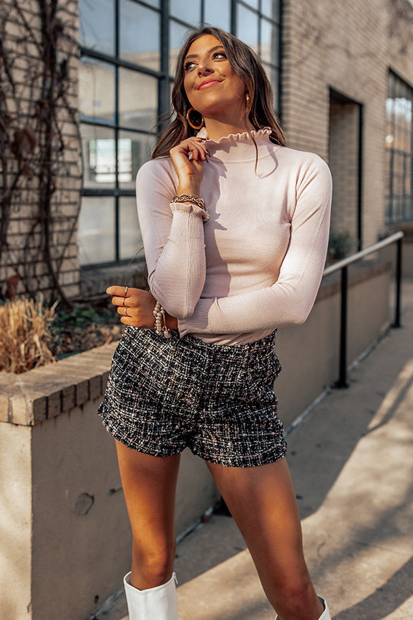 Charmed, I'm sure! The perfect top for layering is hands down our 'Chilly Charms Sweater Top' with its ruffle lettuce hem turtle neck and sleeves. This top is ultra soft and fitted to the body for the perfect first layer to any cardigan or coat!